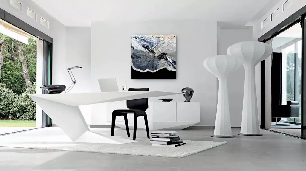 Sideboard with 4 doors, structure in lacquered MDF (many colors available). Interior with shelves in 8 mm-thick tempered transparent glass.
