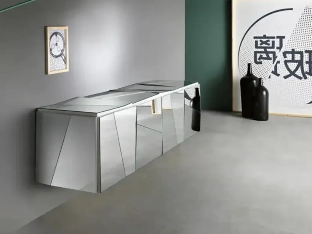Psiche is a four-door suspended sideboard.Designed by architect Giovanni Tommaso Garattoni, it is a designer credenza consisting of a wall-mountable structure. The doors, top, and sides are made from concave and convex panels, covered in glass with finishes in mirror, smoked, bronze, or white lacquered options. These create a sophisticated optical effect, enhancing the value of the environment where this sideboard is placed, be it a living room or bedroom.