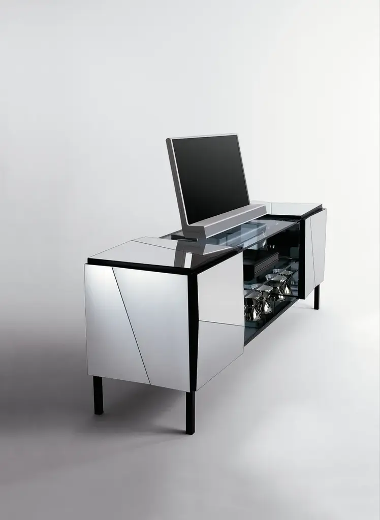 Psiche is a four-door sideboard.Designed by architect Giovanni Tommaso Garattoni, it is a designer credenza consisting of a structure with legs. The doors, top, and sides are made with concave and convex panels, covered in glass with finishes in mirror, smoked, bronze, or white lacquer, creating a highly sophisticated optical effect, enhancing the elegance of the environment where this sideboard is placed, whether in a living room or bedroom.