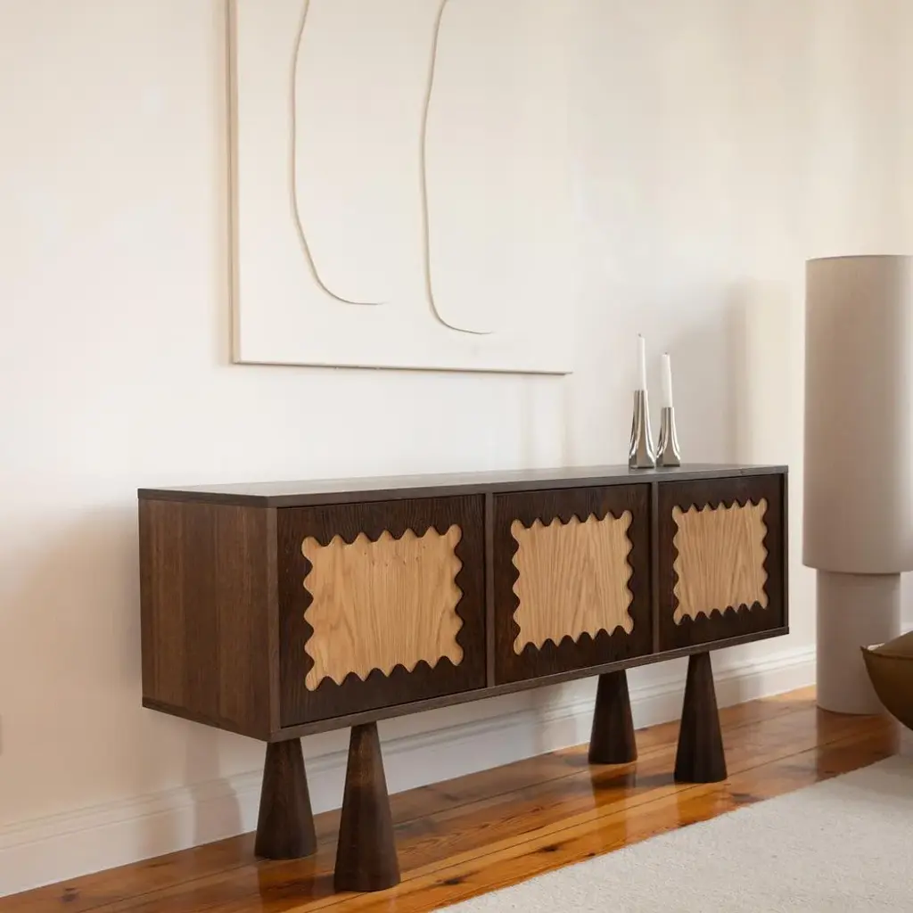 PUZL Sideboard – Elegance with Distinctive Character The PUZL Sideboard is functional sculpture—a powerful design anchored by two solid pillars and doors adorned with rhythmic, organic patterns. The warmth of wood and the subtle interplay of light on its carved surfaces add depth and tranquility to your interior. Intriguing at first glance, this piece commands attention effortlessly, without the need for additional adornment.