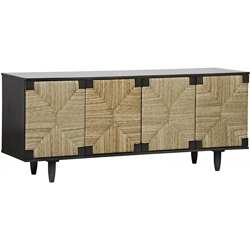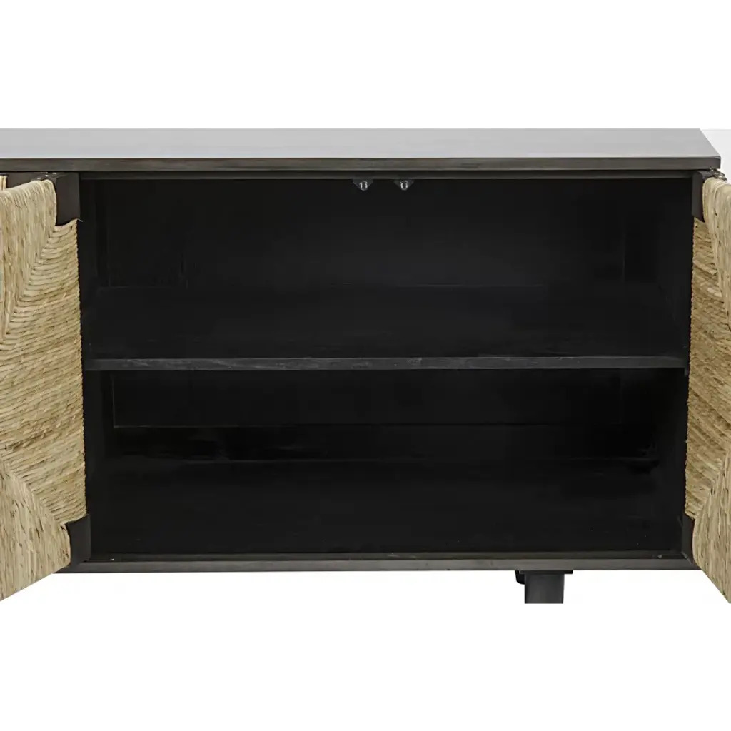 Solid mahogany pairs beautifully with natural sea grass in this updated classic. Designed to provide for maximum display space across the mahogany top, it also features two generous lower compartments with one fixed shelf each.