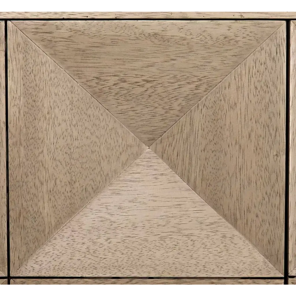 This handcrafted and beautifully finished walnut sideboard features two geometrically carved doors that open via hidden push latch to reveal one large interior cupboard.