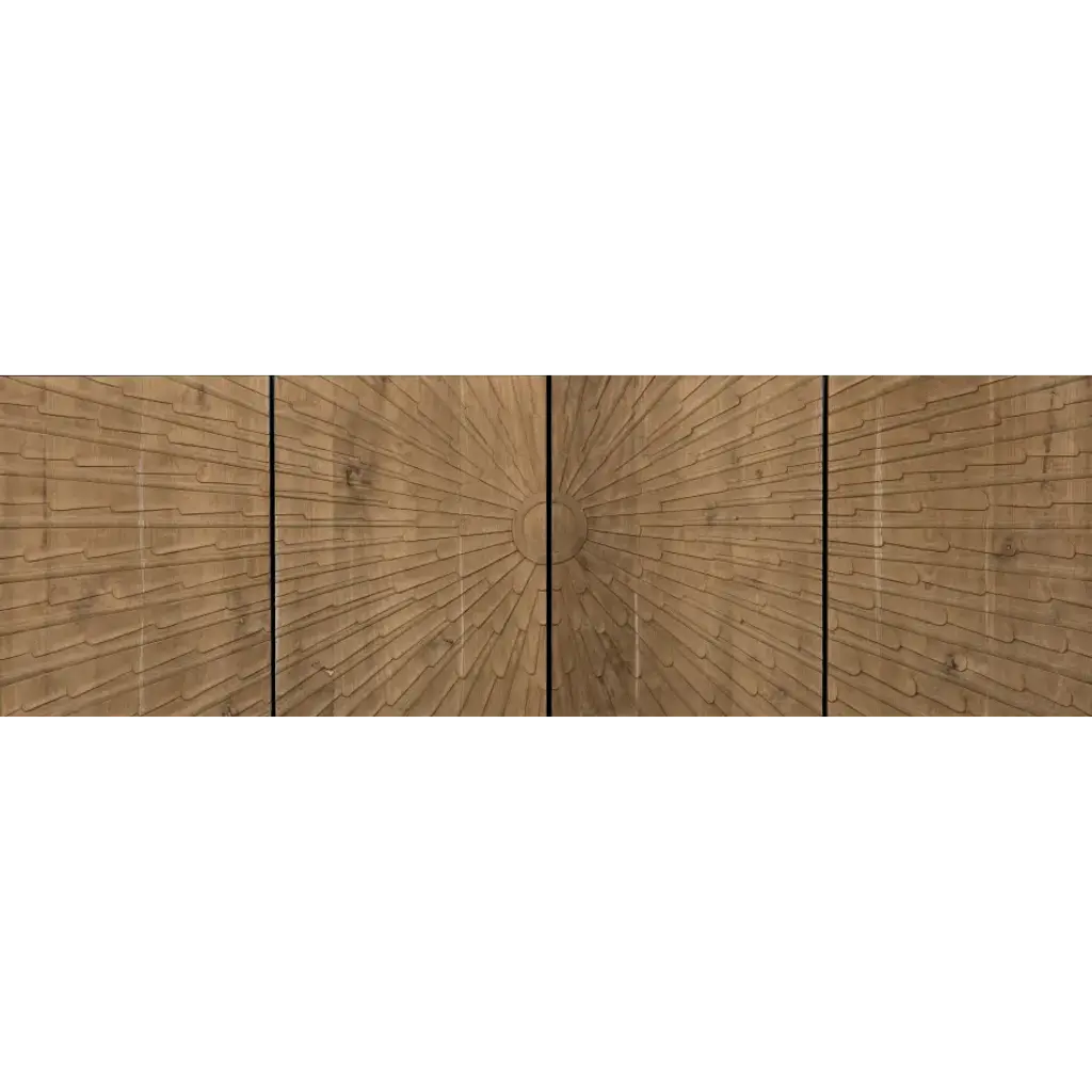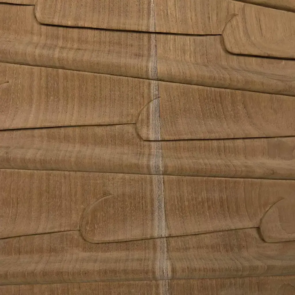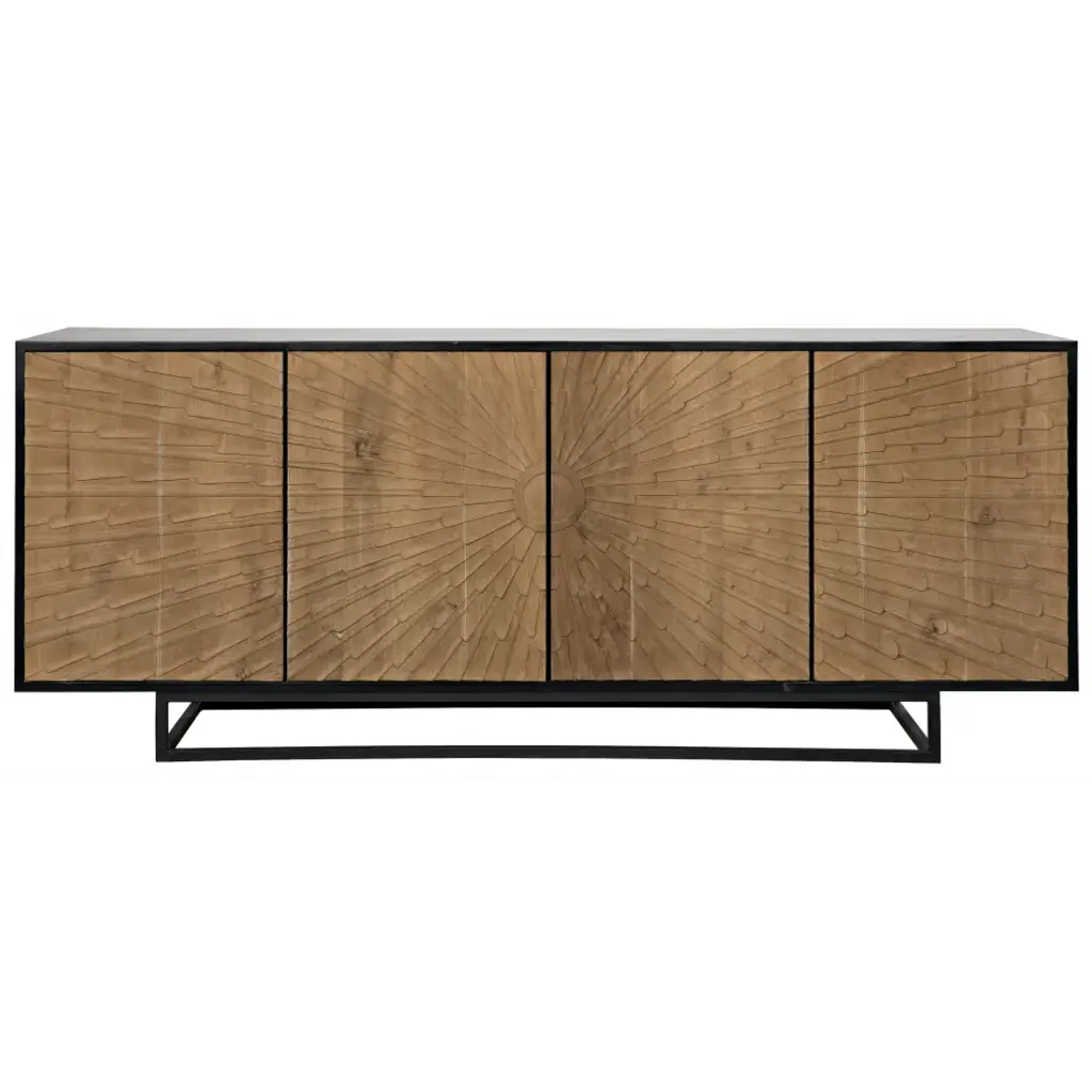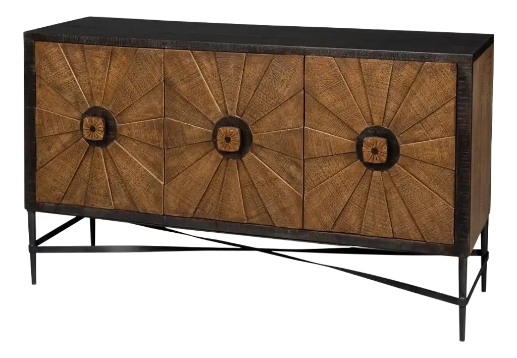 Hand-carved of teak and mahogany, the doors of this mid-century modern sideboard feature exquisite starburst carvings and open to reveal ample storage. The woods feature contrasting and complementary hand rubbed finishes, each chosen to accentuate the beauty of the woodÕs grain.