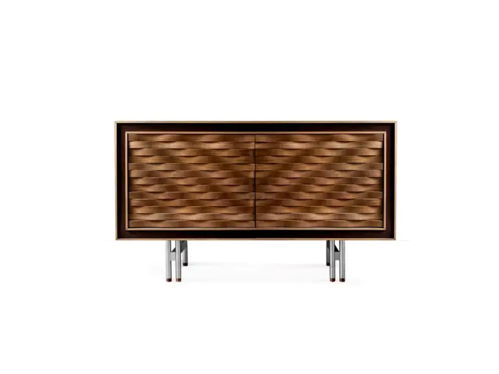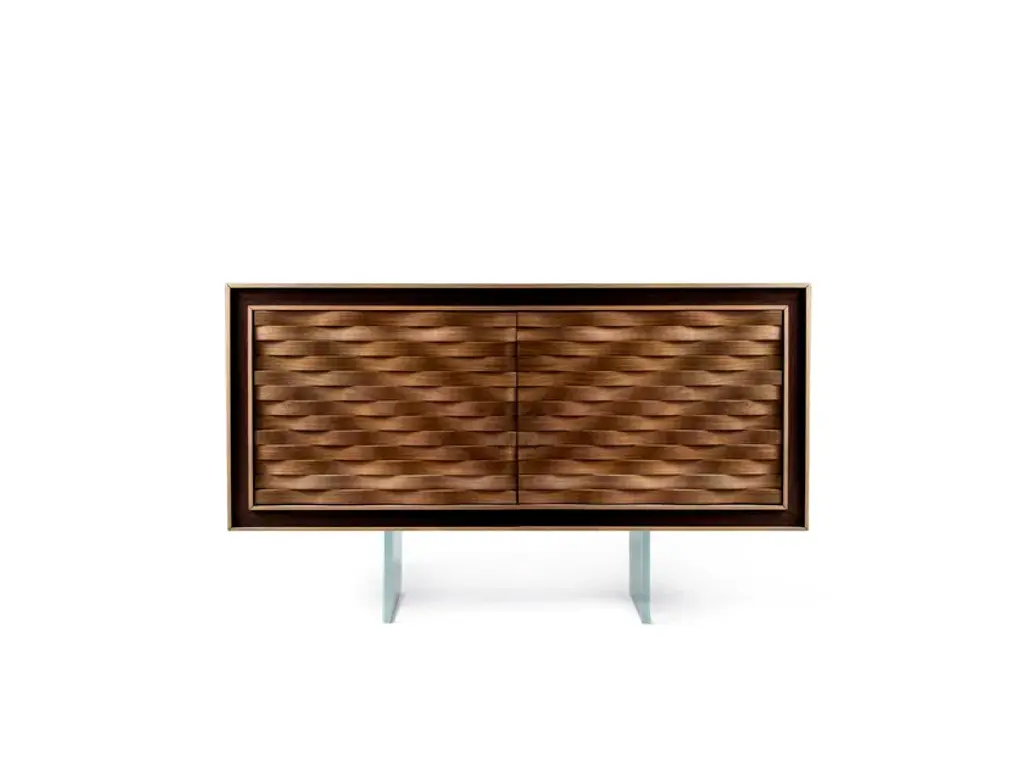 Wooden doors, creating dynamism and a shimmering light. The result is seductive, innovative lines, bringing a feeling of elegance and freshness to the whole room.Frame with walnut veneer. Available in three-door version with two internal compartments and glass shelves. Doors in solid walnut.• Door ARMONIA• Colour: Natural walnut• Finish: Oil