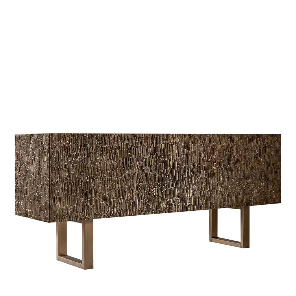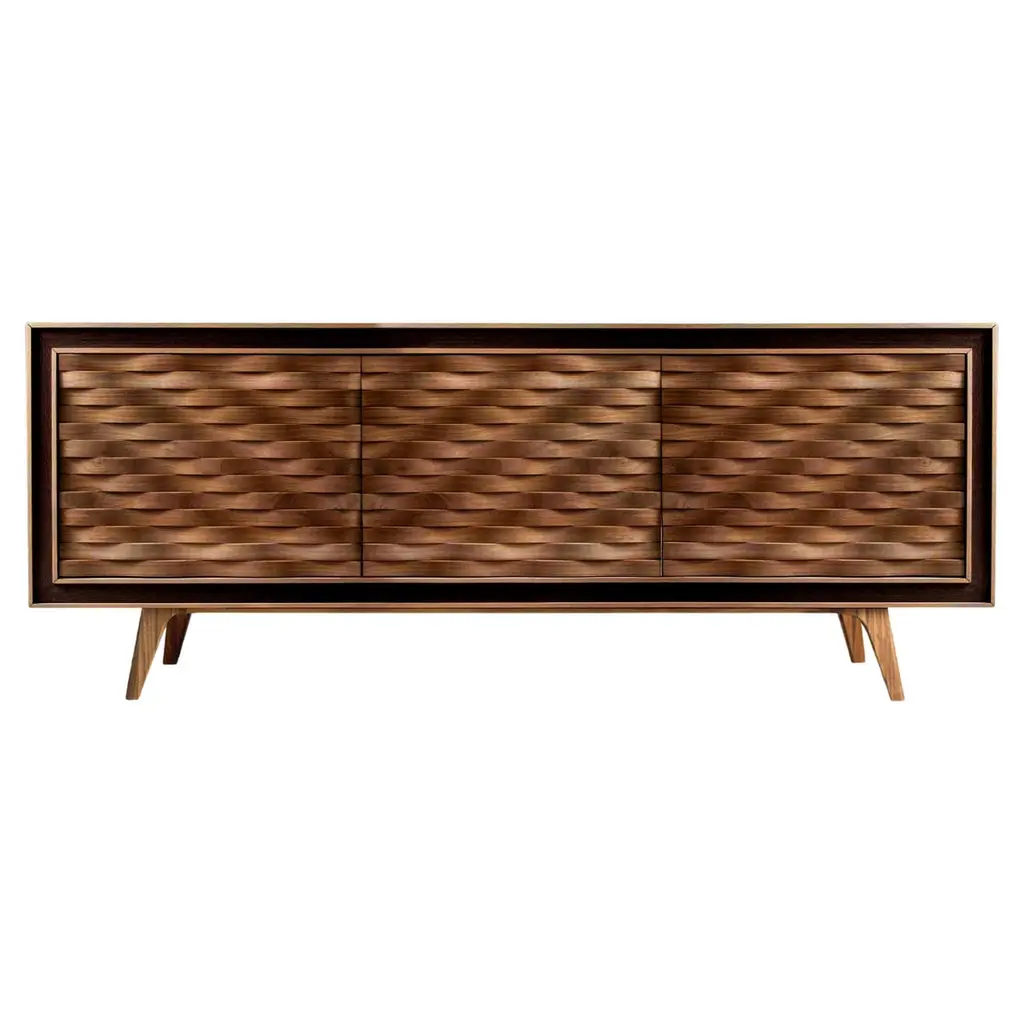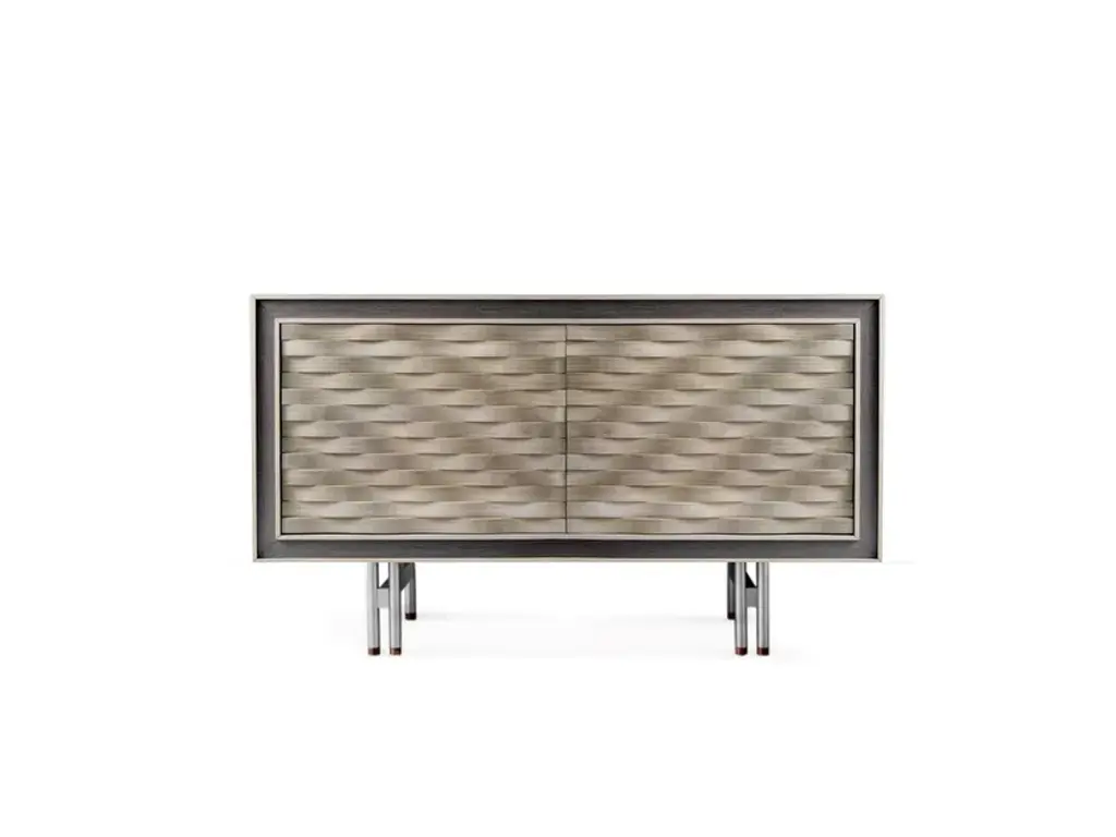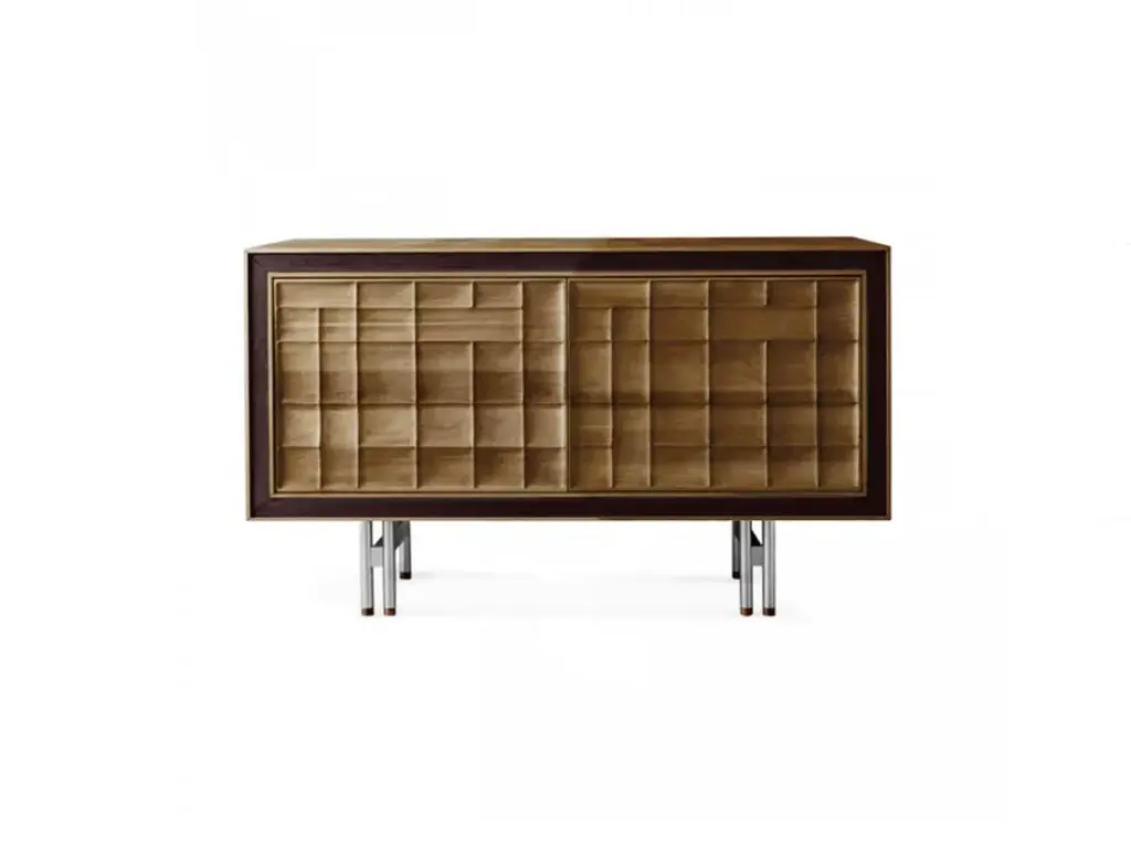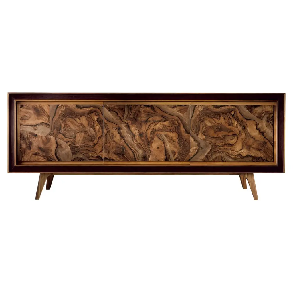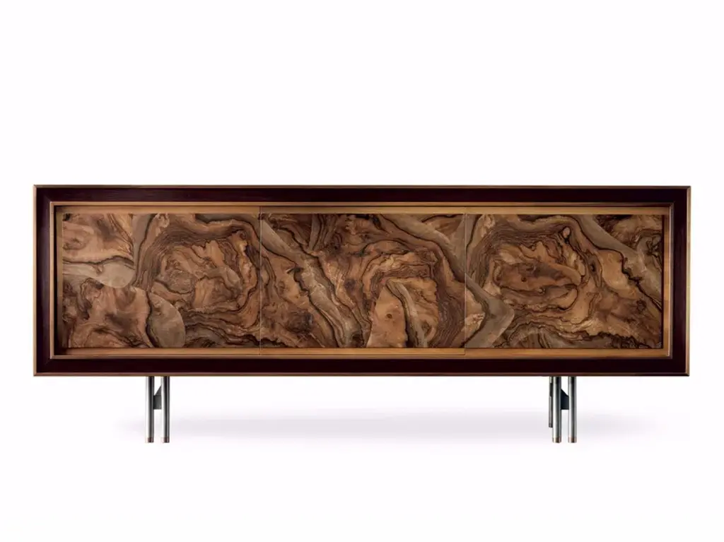 At the centre of a exquisitely contemporary setting with wood panels and niches, the root front of this sideboard is framed in Wenge wood.Frame with walnut veneer. Available in three-door version with two internal compartments and glass shelves. Doors in solid walnut with root veneer.• Door RADICA • Colour Natural walnut• Finishing Oil