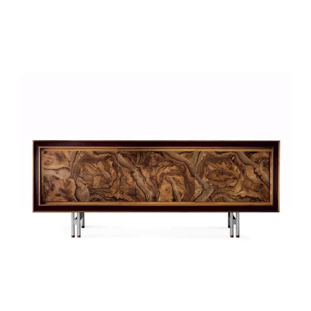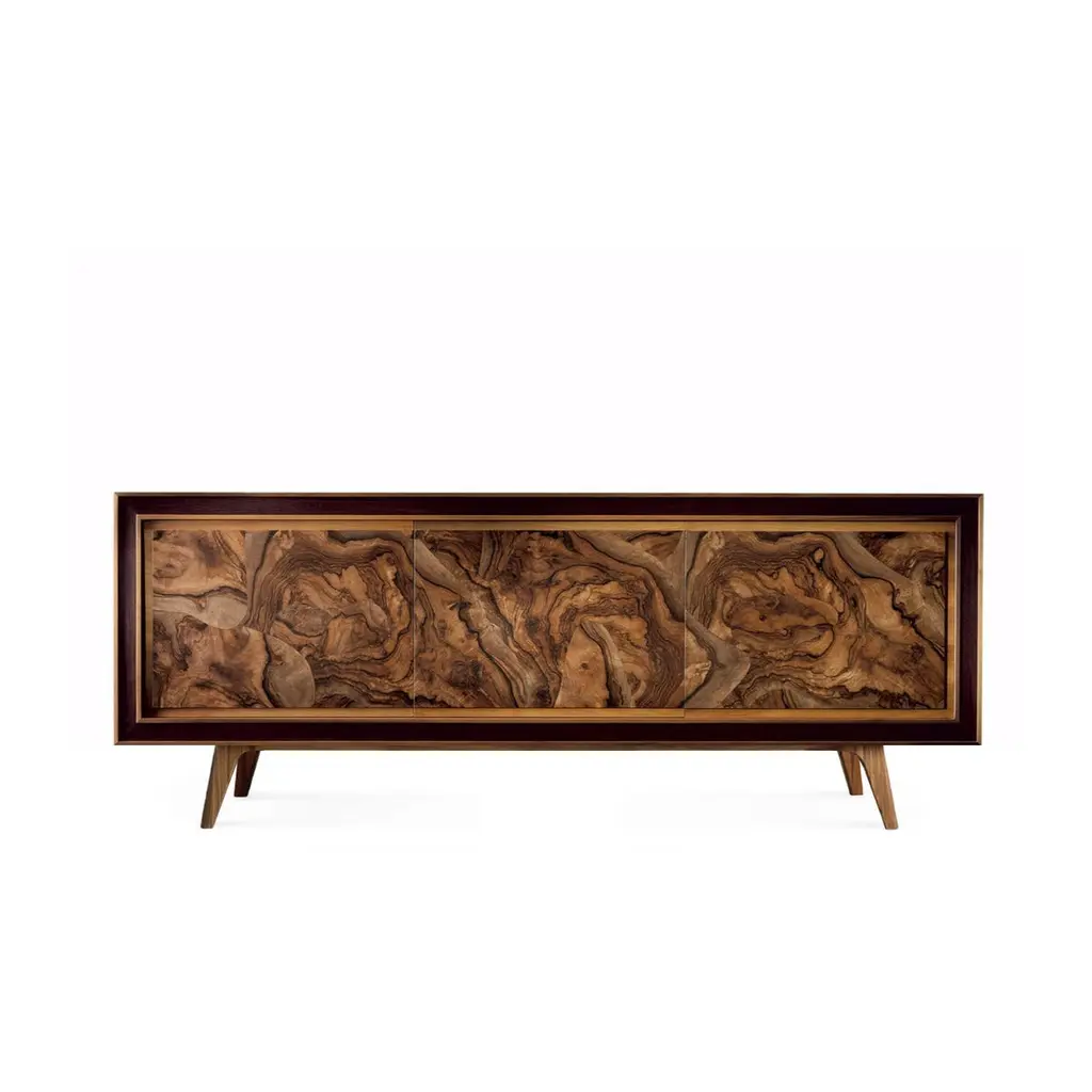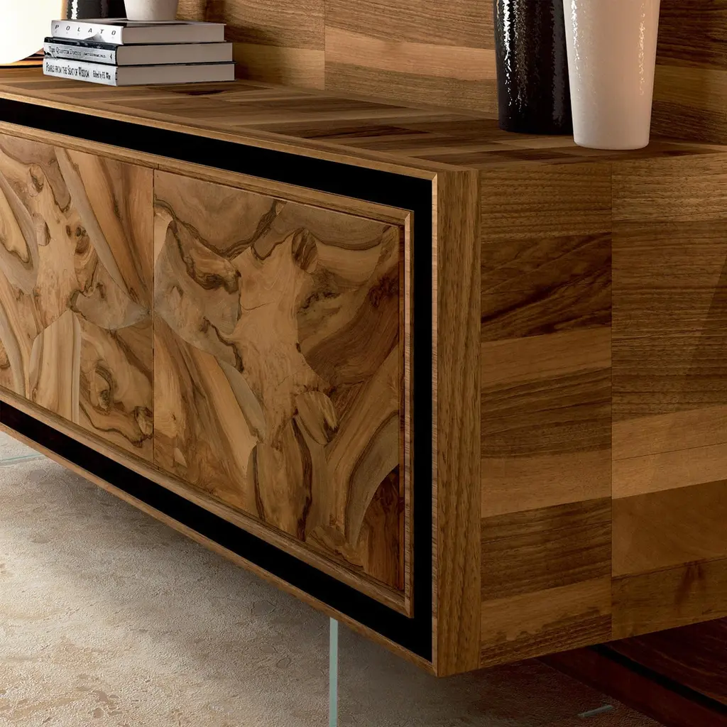 An elegant, stunning sideboard finely crafted in Italy with passion by expert hands. It's composed of three doors in premium solid walnut with fine root veneer, each piece is unique, presenting different wood veins. The oil finish brings out the elegant natural designs of the wood giving this piece extreme sophistication and beauty. The feet are in a transparent glass as the internal glass shelves. Since it is handmade we can customize it to obtain a unique, tailor-made design piece.Available in different dimensions: W. 192 cm D. 50 cm H. 77/80/85 cm.For customers within the European community: prices will have a 20% surcharge (VAT) to be verified during the negotiation phase.
