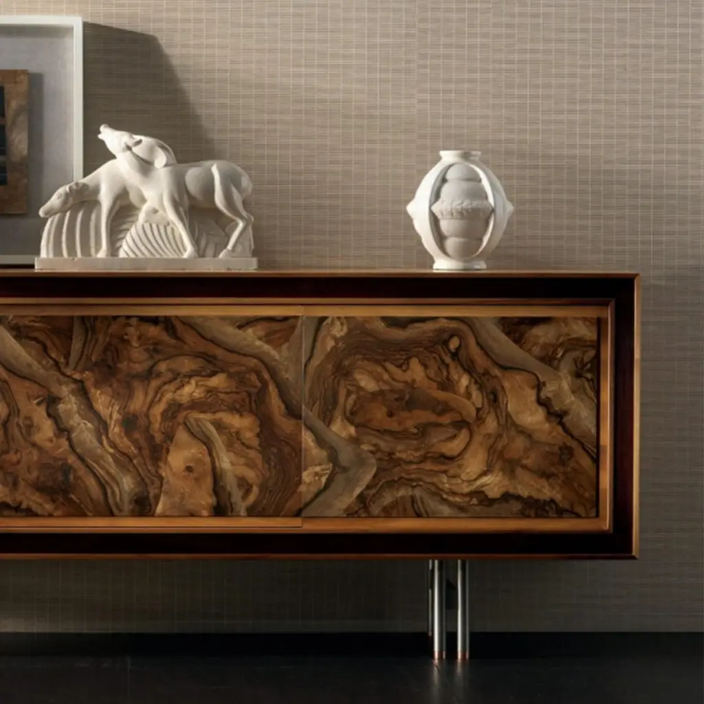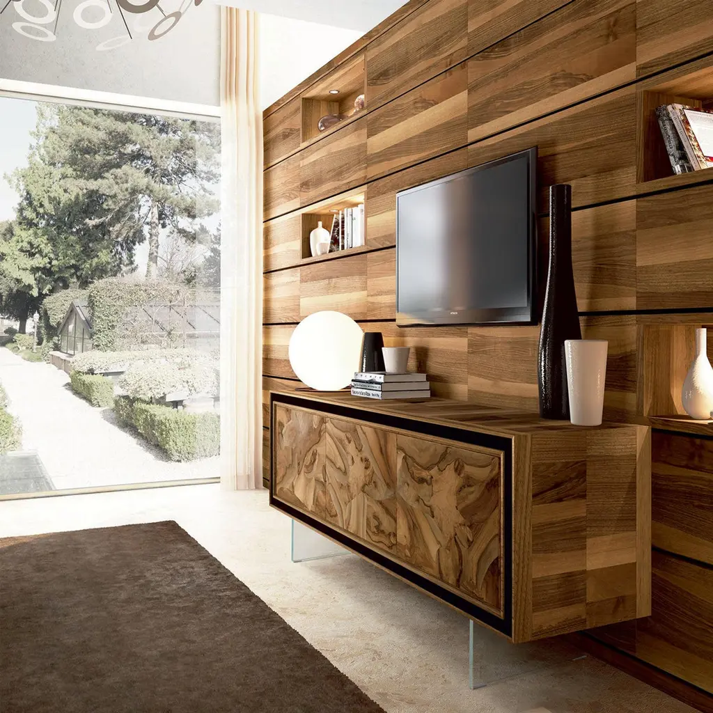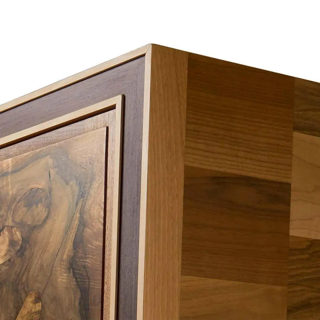 An elegant, stunning sideboard finely crafted in Italy with passion by expert hands. It's composed of three doors in premium solid walnut with fine root veneer, each piece is unique, presenting different wood veins. The oil finish brings out the elegant natural designs of the wood giving this piece extreme sophistication and beauty. The feet are in a transparent glass as the internal glass shelves. Since it is handmade we can customize it to obtain a unique, tailor-made design piece.Available in different dimensions: W. 192 cm D. 50 cm H. 77/80/85 cm.For customers within the European community: prices will have a 20% surcharge (VAT) to be verified during the negotiation phase.
