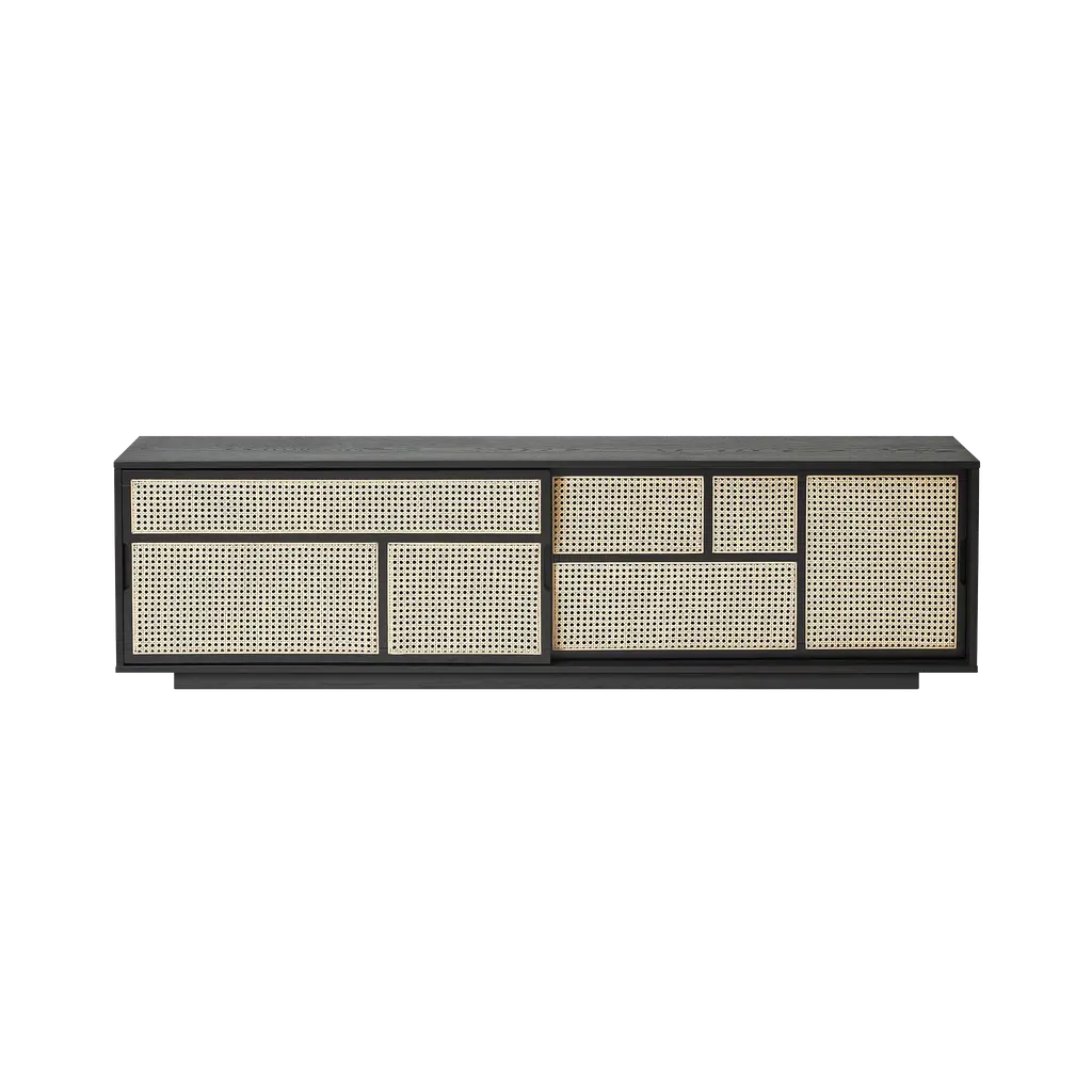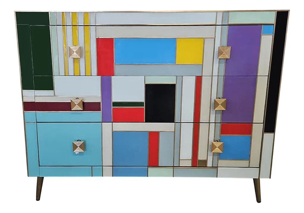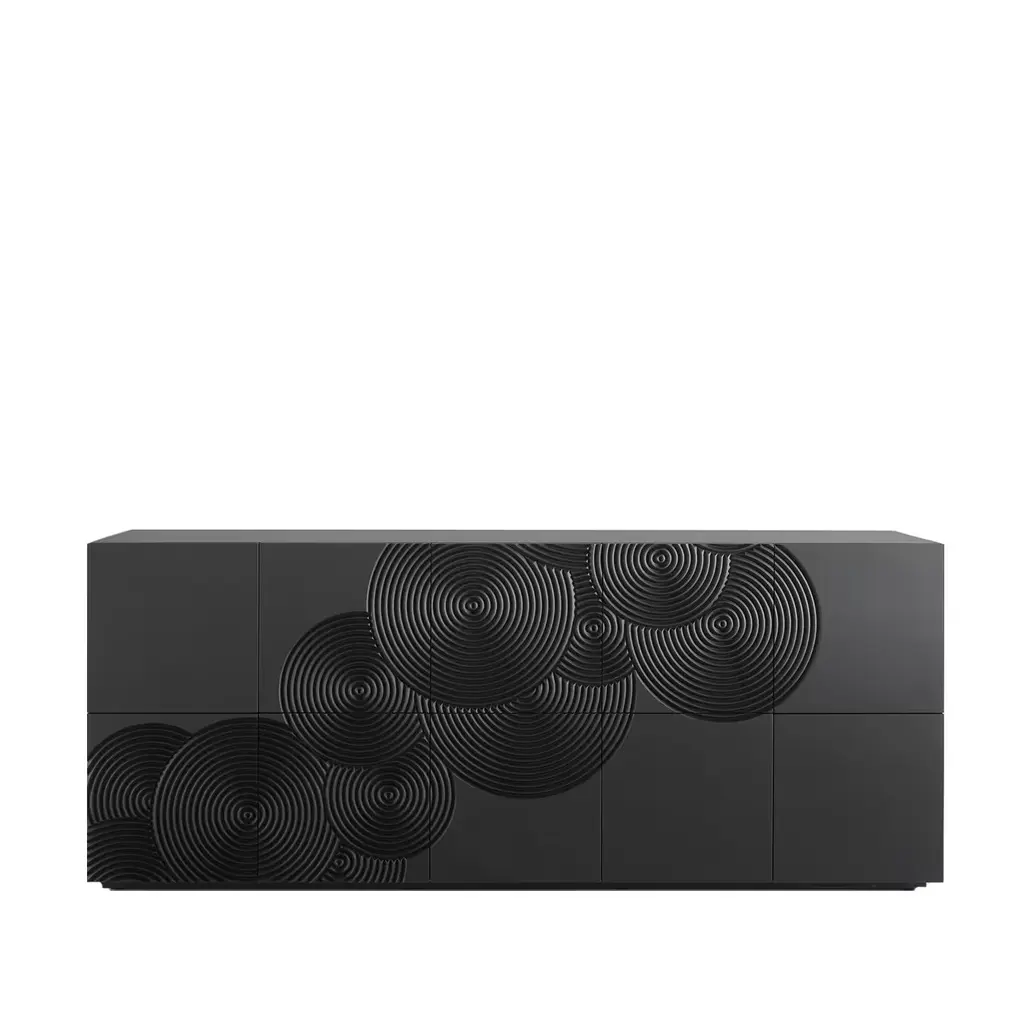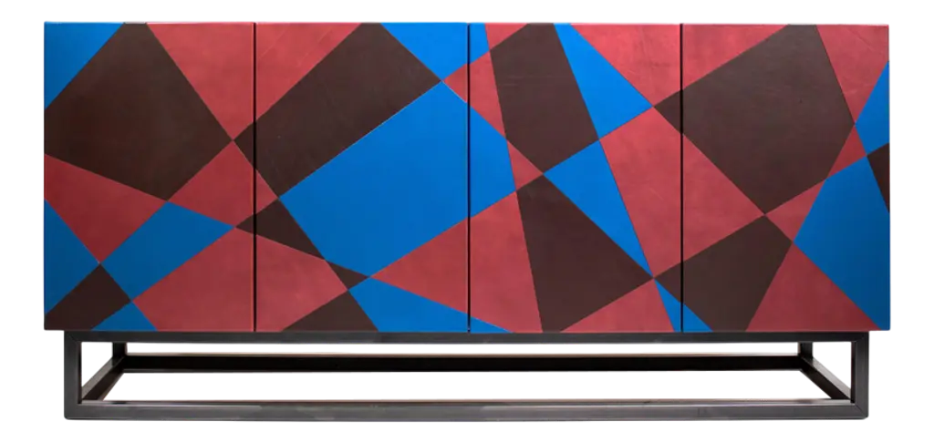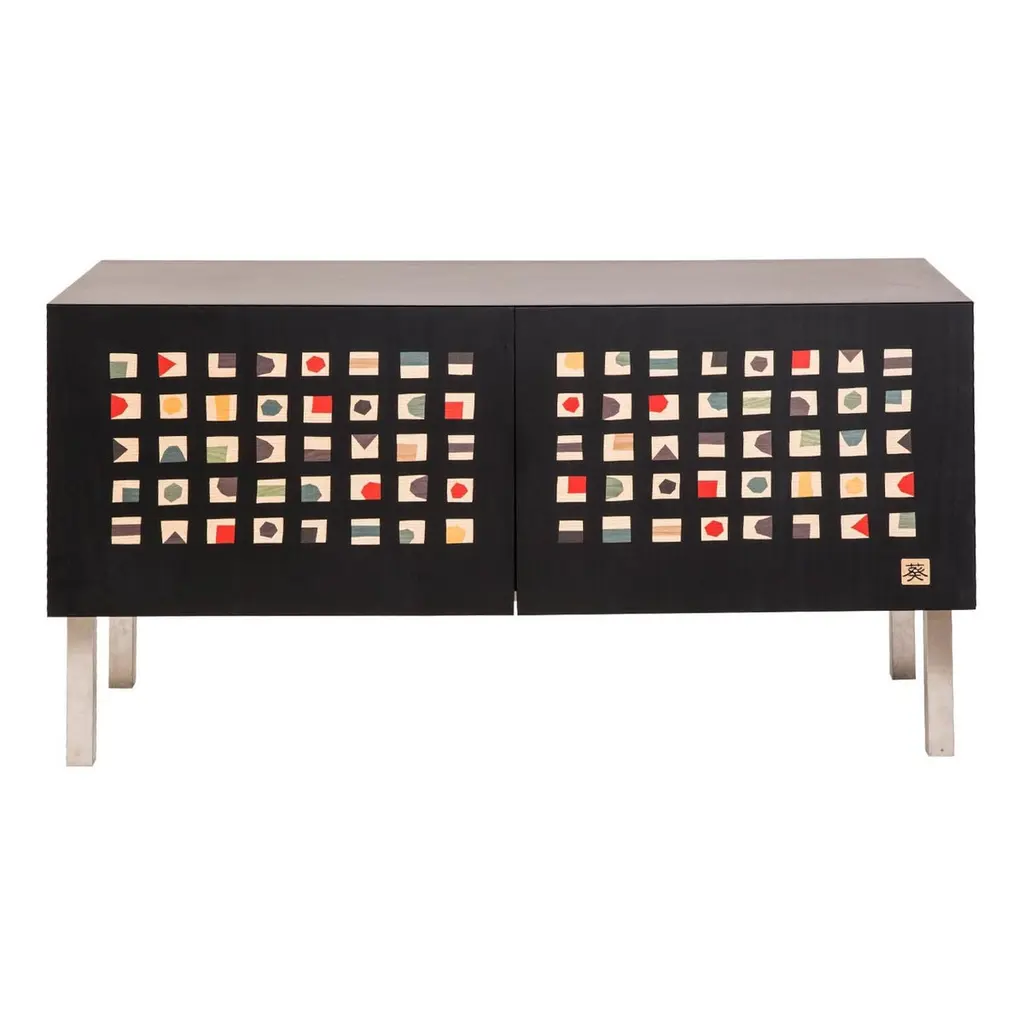 Colorful modernist patterns on dark wood imbue this foo sideboard with a singular charm. Designed by Aoi Hubert Kono and handcrafted using poplar wood and maple wood veneer by the expert artisans of Laura Meroni, this cabinet features adjustable wood shelves and an adjustable base, worked from brushed stainless steel. Limited Edition.