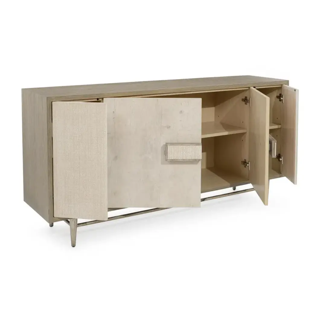 The case of this four-door sideboard has a driftwood finish. The door fronts are finished in a silver white tiza gesso and white gesso.