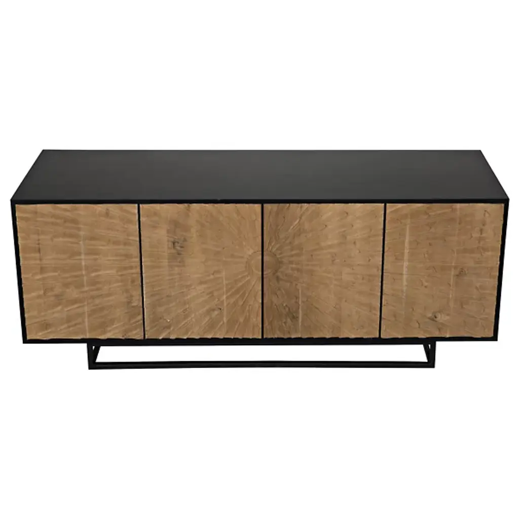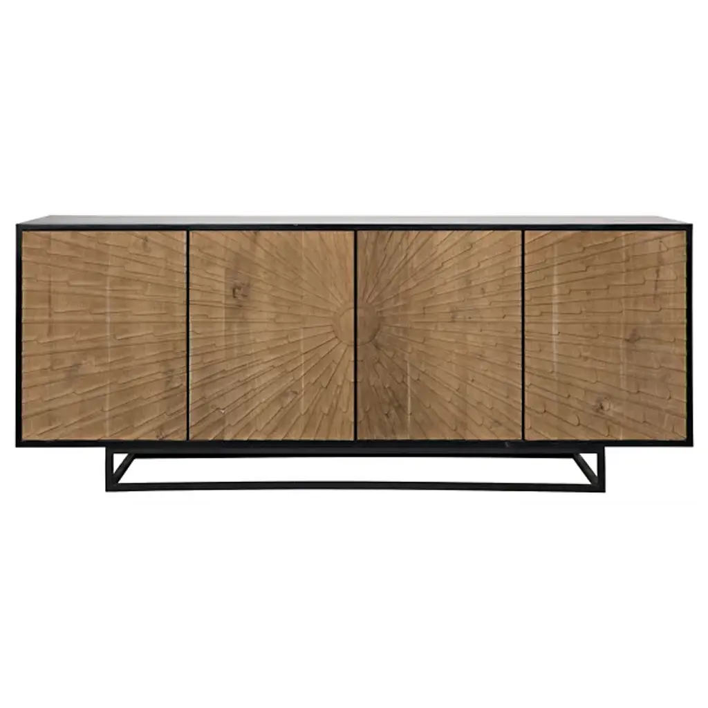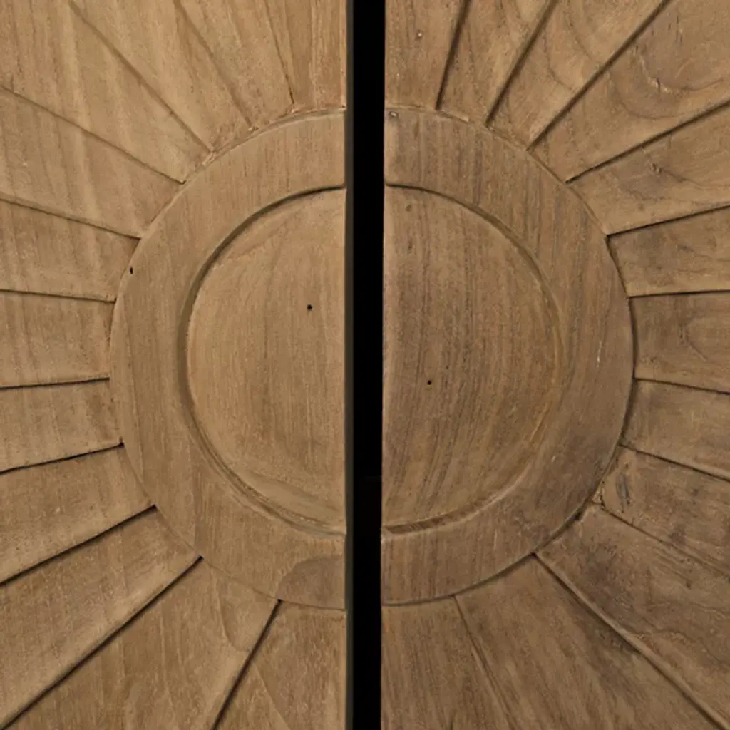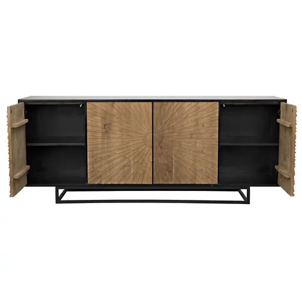 The Ra Sideboard from Noir showcases hand-carved starburst patterns that radiate outward from central points on each door panel, creating focal points that draw the eye inward. These mid-century modern motifs demonstrate traditional carving skills applied to period-appropriate design while contrasting wood finishes highlight the natural grain differences between teak and mahogany. Each door opens to reveal generous storage compartments perfect for dining essentials, entertainment equipment, or seasonal items that need organized housing within living or dining areas.