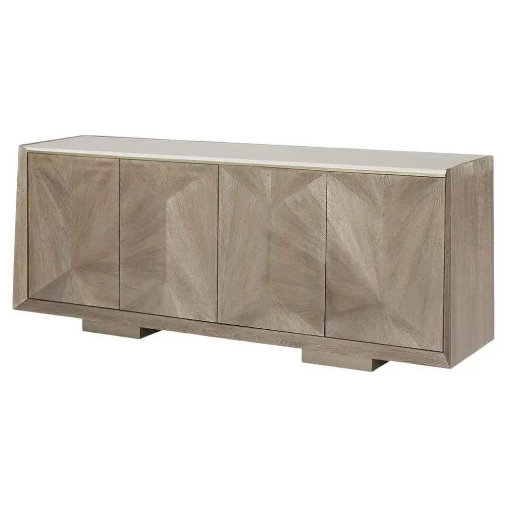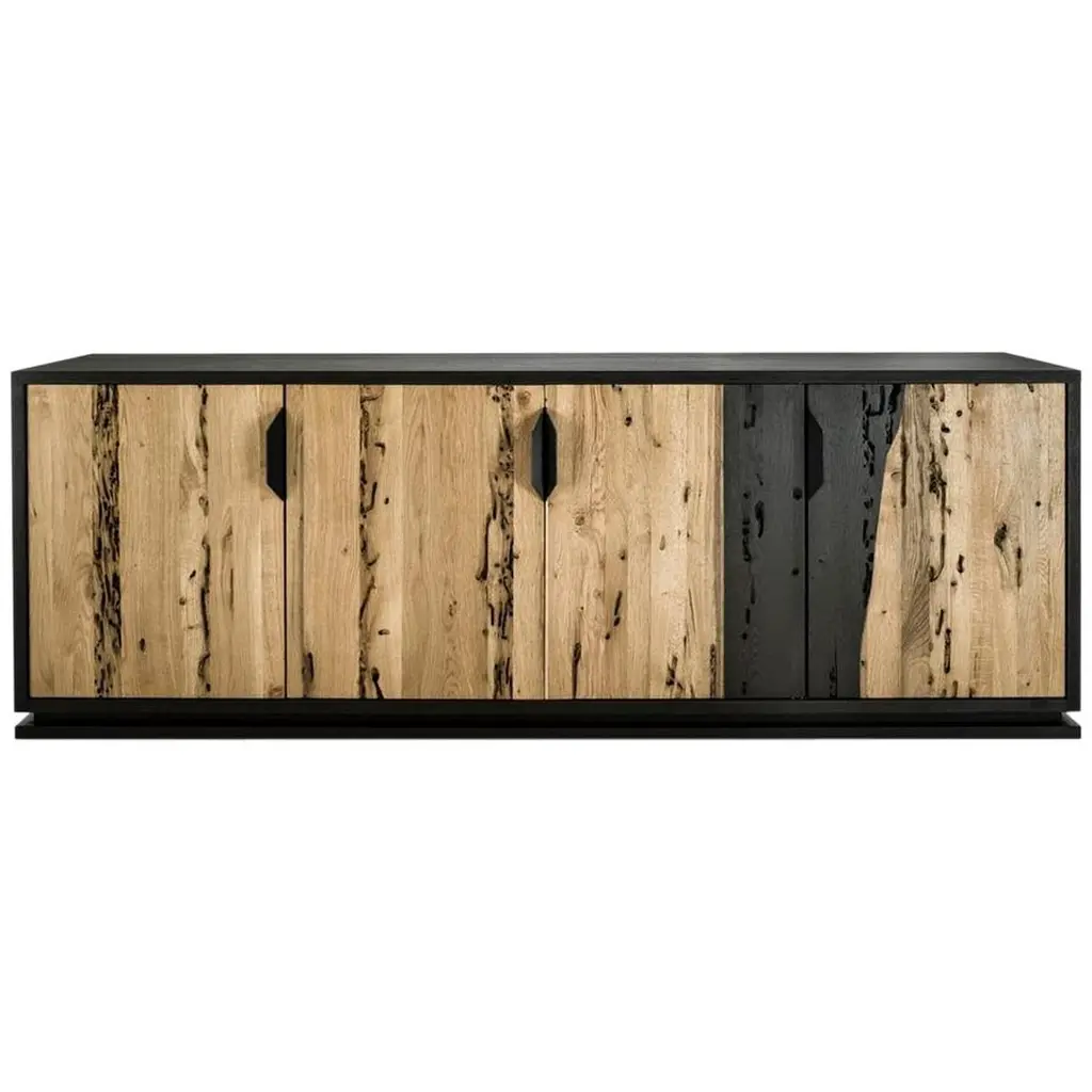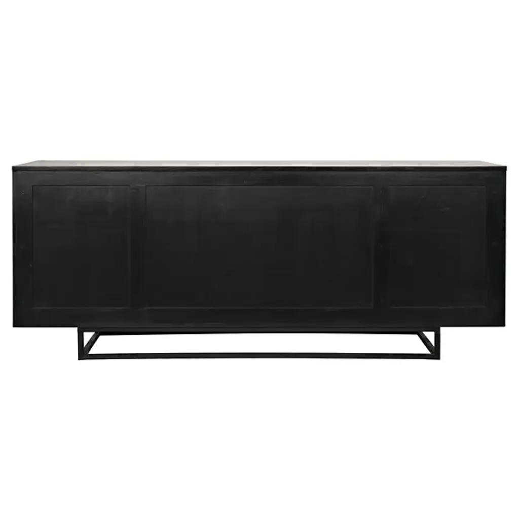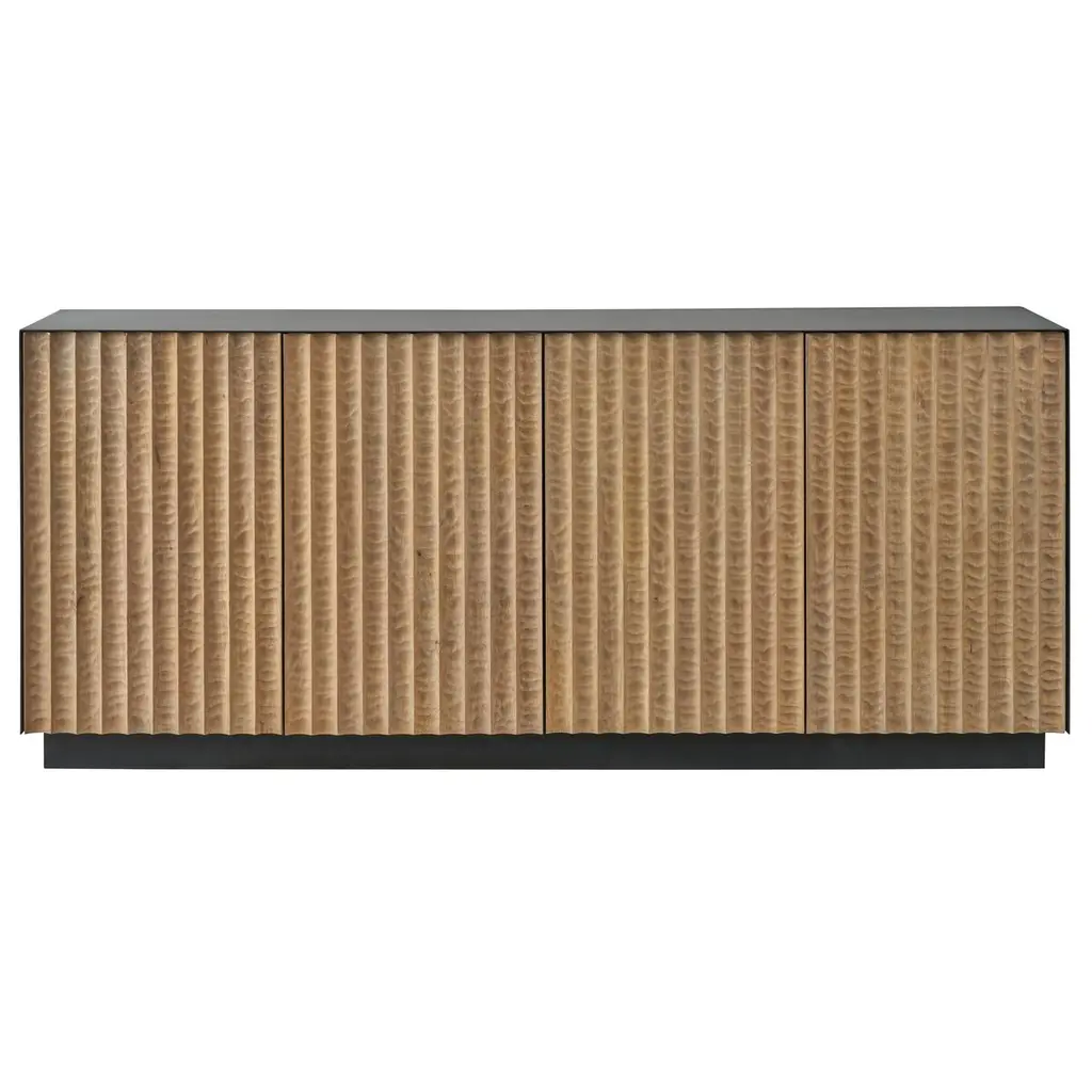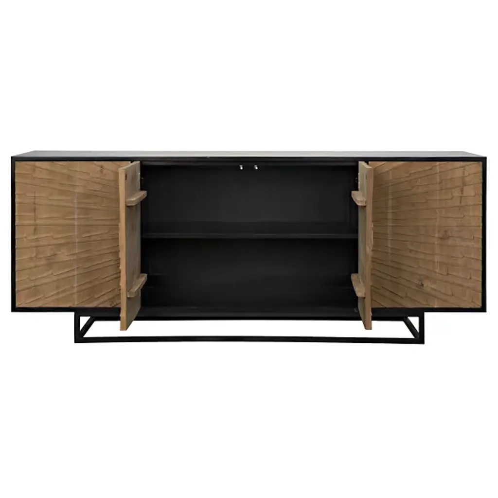 The Ra Sideboard from Noir showcases hand-carved starburst patterns that radiate outward from central points on each door panel, creating focal points that draw the eye inward. These mid-century modern motifs demonstrate traditional carving skills applied to period-appropriate design while contrasting wood finishes highlight the natural grain differences between teak and mahogany. Each door opens to reveal generous storage compartments perfect for dining essentials, entertainment equipment, or seasonal items that need organized housing within living or dining areas.