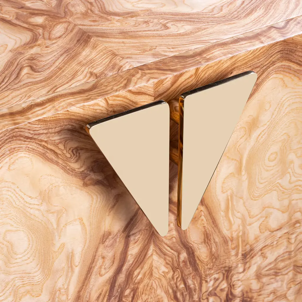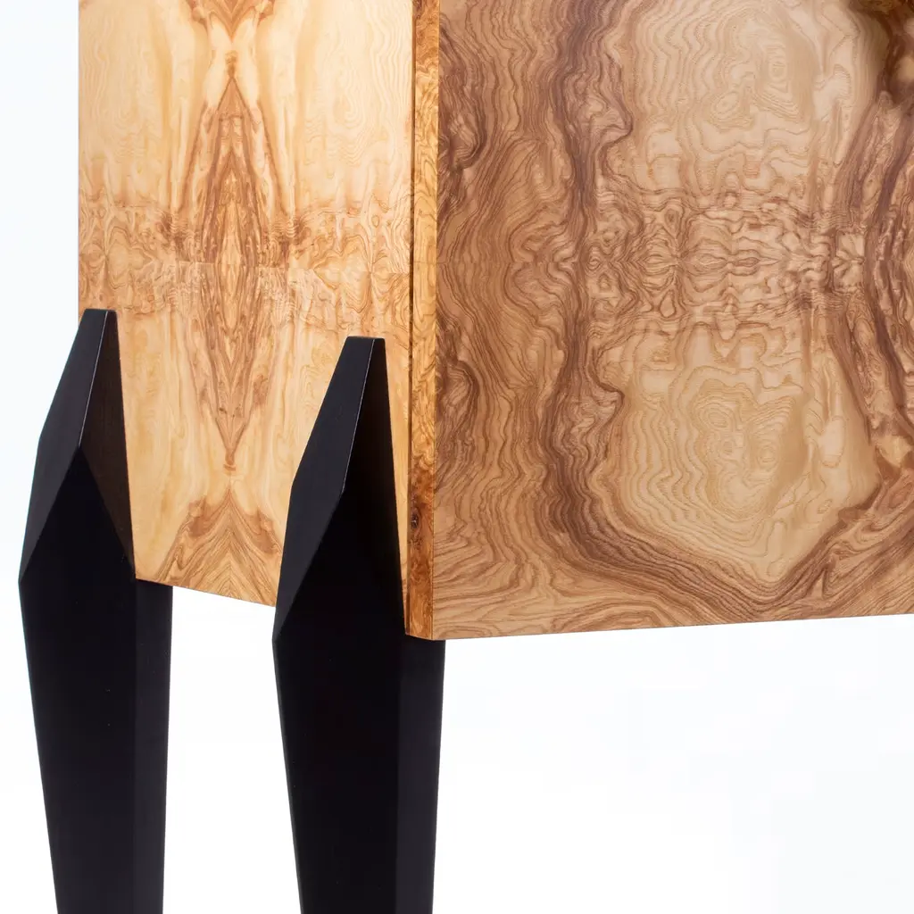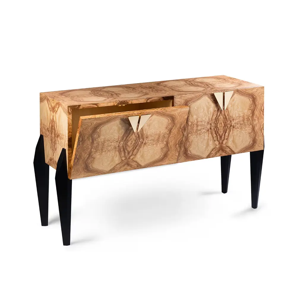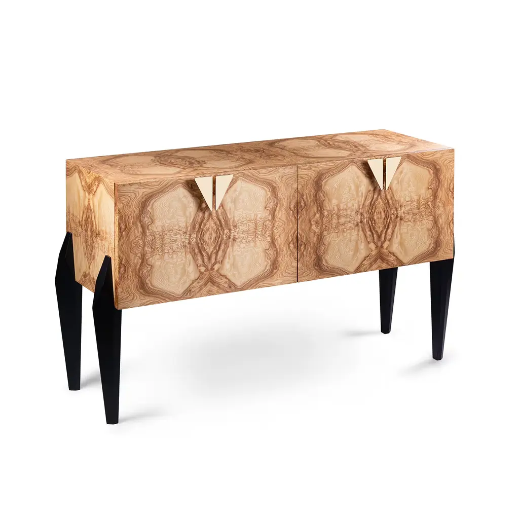 Named after the Italian word for "spider" due to the distinctive shape of its legs, this extraordinary sideboard exudes a timeless and sophisticated modern allure. Inspired by the sumptuous Hollywood ambiance of the '30s and '40s, it is handcrafted of precious materials: briar-root, olive wood, and ebony merge in this splendid design, enriched with 24k gold-plated handles for additional refinement.