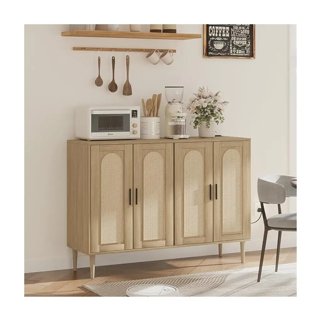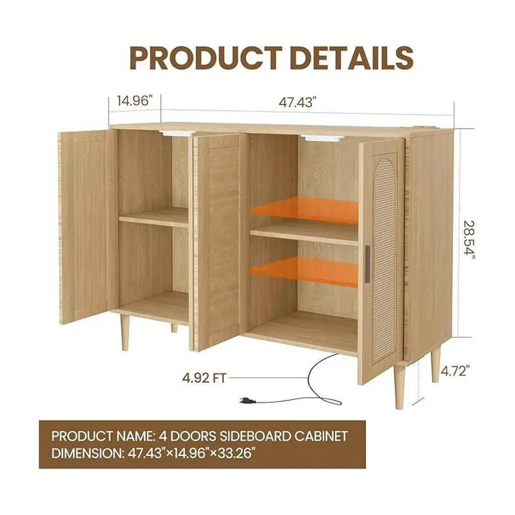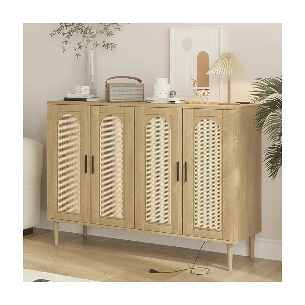 Rattan Cabinet With Power Outlet, Boho Sideboard Buffet With 4 Doors, With Adjustable Shelf For Hallway, Dining Room, Living Room, Bar (Wood)