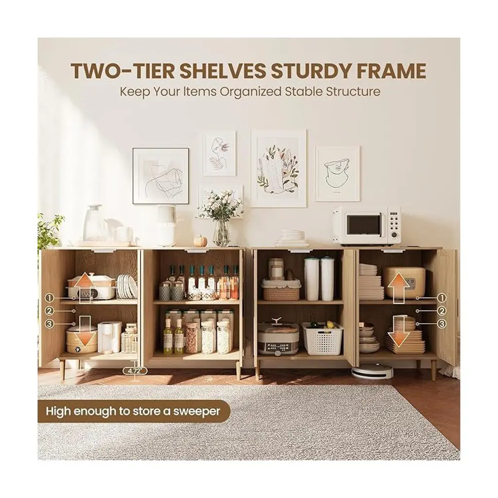 【Sideboard Buffet Cabinet with Storage】This sideboard combines open and closed storage to meet your different needs. The spacious countertop makes it easy to place items. Three convenient drawers help organize cutlery neatly. Two base cabinets, each featuring internal shelves, offer ample space for storing mugs, extra dinnerware, and other essentials. 【BOHO Sideboard Buffet】Use it as an entryway cabinet to display family photos and treasured mementos in your hallway. Place it as an accent cabinet in your living room to keep small items organized. Or utilize it as a sideboard or buffet cabinet for storing dinnerware and small appliances. 【Wood Sideboard Cabinet with Power Outlet】Functioning as a sturdy wooden TV stand, it features a built-in power outlet with 2 AC outlets and 2 USB ports, conveniently powering your TV, sound system, Wi-Fi router, and more. It's an ideal solution for both living rooms and small apartments. 【Rattan Cabinet】This wooden sideboard with rattan doors seamlessly blends farmhouse charm with elegant modern style, effortlessly complementing any cottage-core, contemporary, farmhouse-chic, or traditional interior. 【Sturdy & Safe Wood Buffet Cabinet】Crafted from premium MDF with rattan-woven accents and durable hardware fittings, this sideboard buffet cabinet delivers exceptional stability and long-lasting durability. Overall dimensions: 14.96" × 47.43" × 33.26"(D*W*H).
