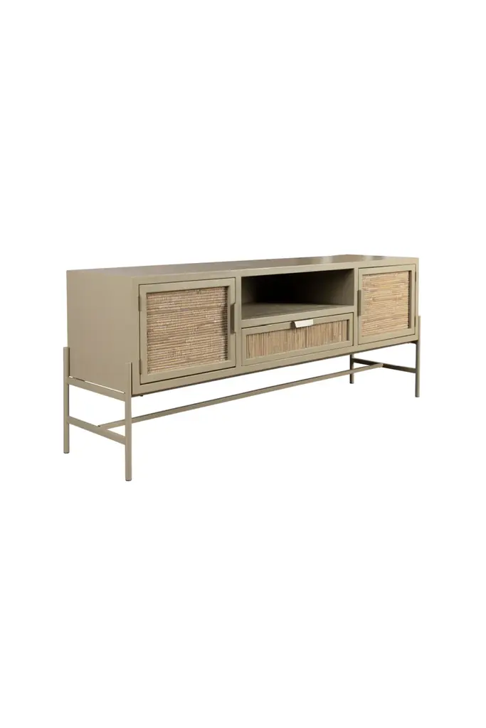 Spruce up your living area with the Yasu Sideboard by Dutchbone. Crafted from Chinese Fir, veneered and lacquered in a soothing beige finish, it's supported by iron legs, with rattan door fronts that add a touch of texture. With two doors on each side, an open center compartment, and a discreet bottom drawer, Yasu transforms your space into an organized haven.