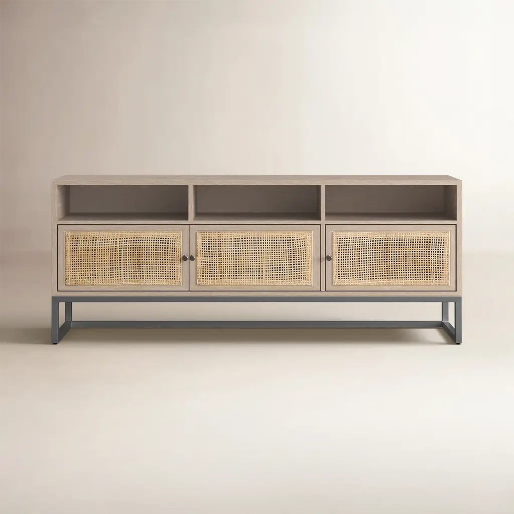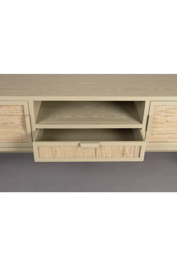 Spruce up your living area with the Yasu Sideboard by Dutchbone. Crafted from Chinese Fir, veneered and lacquered in a soothing beige finish, it's supported by iron legs, with rattan door fronts that add a touch of texture. With two doors on each side, an open center compartment, and a discreet bottom drawer, Yasu transforms your space into an organized haven.