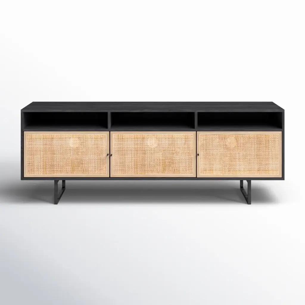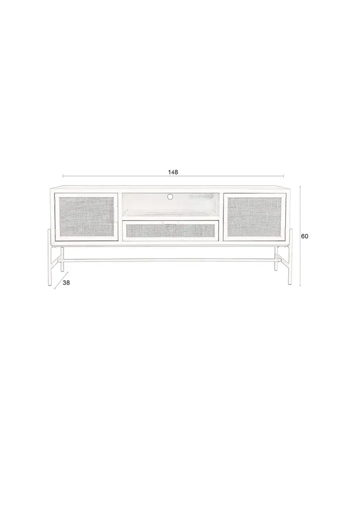 Spruce up your living area with the Yasu Sideboard by Dutchbone. Crafted from Chinese Fir, veneered and lacquered in a soothing beige finish, it's supported by iron legs, with rattan door fronts that add a touch of texture. With two doors on each side, an open center compartment, and a discreet bottom drawer, Yasu transforms your space into an organized haven.