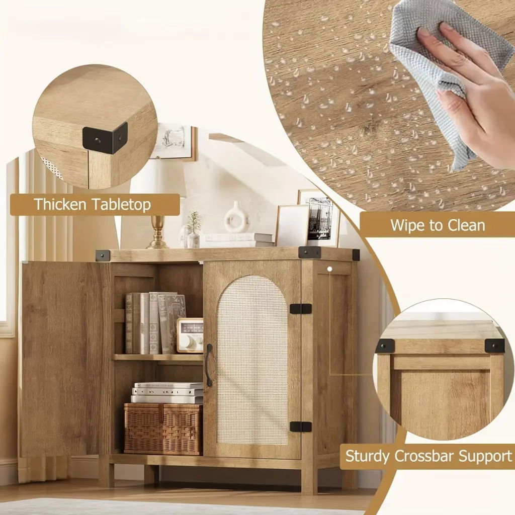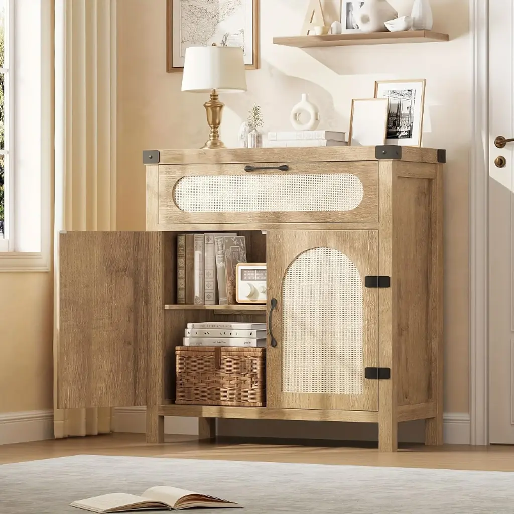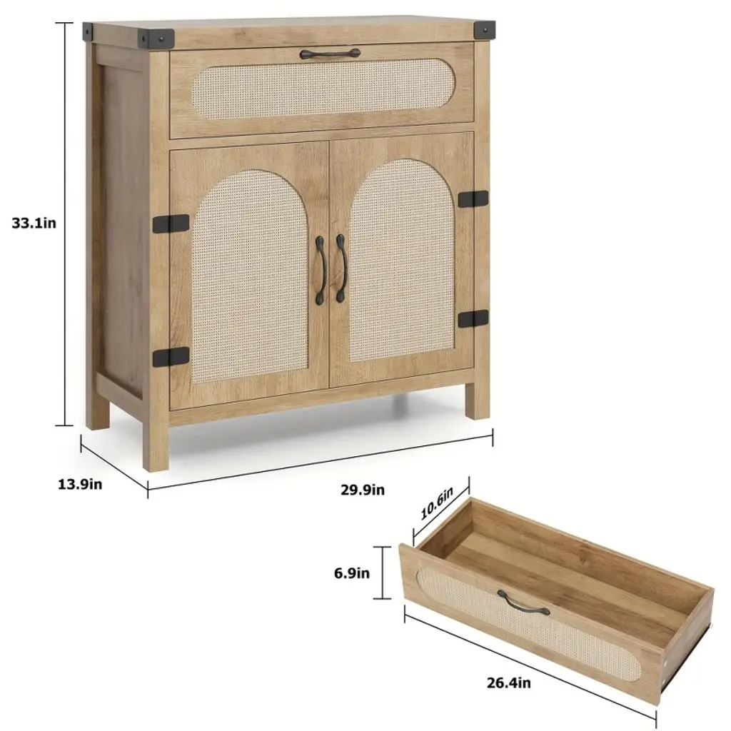 Rattan Sideboard Buffet Cabinet, 30'' Wooden Coffee Bar Storage Cabinet With Drawers, Modern Console Cabinet For Kitchen Living Room Hallway Brown