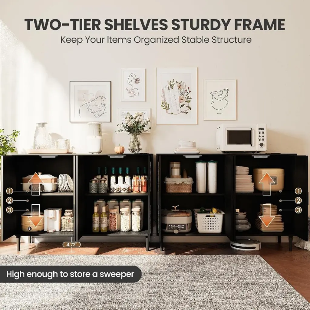 Rattan Sideboard Buffet Cabinet, 4 Doors Accent Storage Cabinet, Console Table Coffee Bar With Power Outlet, Adjustable Shelves