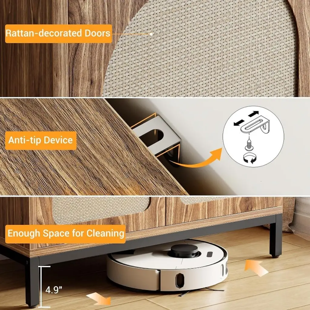 Introducing the Rattan Sideboard Buffet Cabinet, a versatile piece that seamlessly blends functionality with aesthetic appeal. This elegant accent storage cabinet features double arched doors adorned with intricate rattan weaving, offering a unique visual charm that enhances any living space, whether in your dining room, hallway, or living room. Designed for multi-functional use, this buffet cabinet is perfect for various settings. Use it as a stylish credenza, a coffee bar cabinet, or a liquor cabinet. Its spacious desktop and ample storage options make it suitable for displaying décor, storing kitchen dinnerware, and organizing kitchen tools, ensuring your space is both functional and fashionable. Crafted with durability in mind, this cabinet features thick particle boards and sturdy metal feet, providing stability and longevity. The anti-tip kit included ensures safety, particularly in homes with children, while the adjustable foot pads allow for stability on uneven surfaces, eliminating any wobbling. The Rattan Sideboard Buffet Cabinet boasts a large storage capacity, with two rattan doors opening to reveal a three-level adjustable shelf. With height options differing by 1.18 inches, you can customize the interior space to cater to your specific storage needs, making it as practical as it is beautiful. Assembly is straightforward with clear instructions and labeled parts, ensuring you can enjoy your new furniture in no time. Plus, the surface is resistant to stains, heat, and scratches, making maintenance a breeze. With excellent customer support available, you can shop with confidence knowing assistance is just a call away.