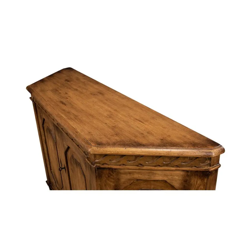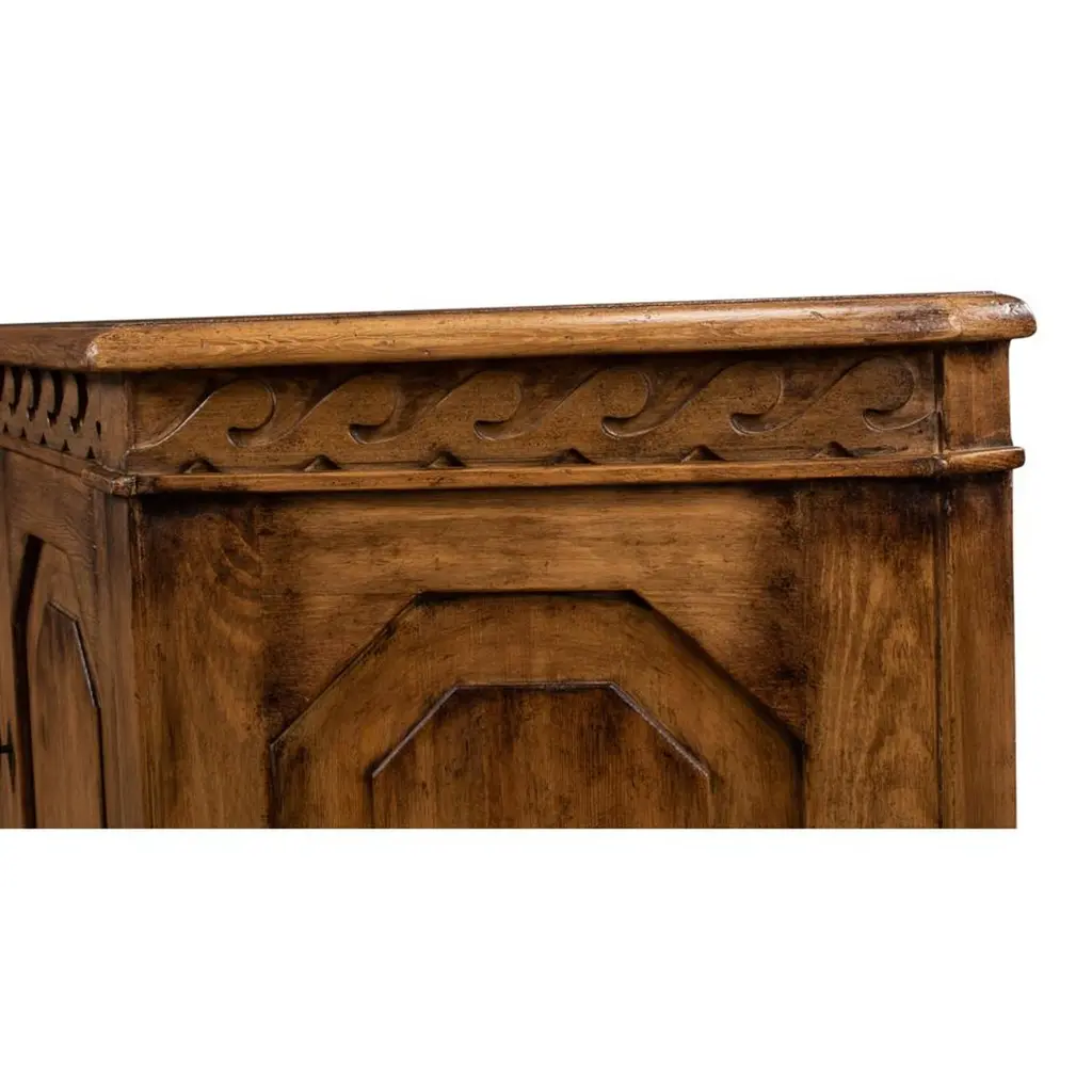 Finished in an exquisite hand-rubbed medium brown finish, is a statement of timeless elegance. Crafted from reclaimed pine, this sophisticated piece features canted ends and intricate Vitruvian scrolls, adding a refined architectural element to any interior. With ample storage behind two central cupboard doors. Raised on square tapered legs, it exudes a delicate balance of strength and grace. Dimensions: 58" W x 16" D x 36" H