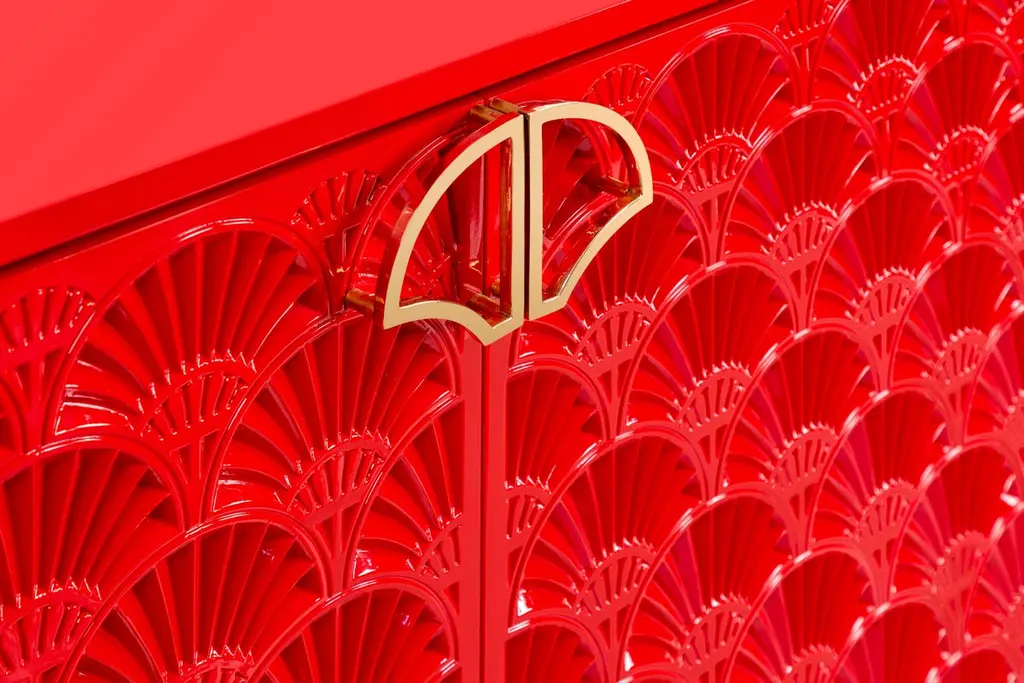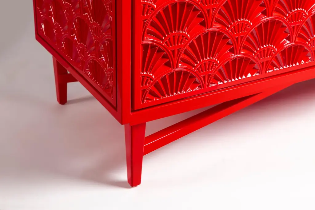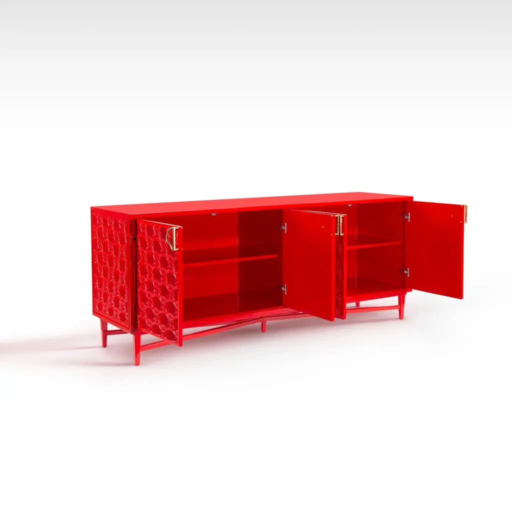 Red Lacquered Luxury Sideboard With Modern Lotus Pattern And Brass Lotus Handle