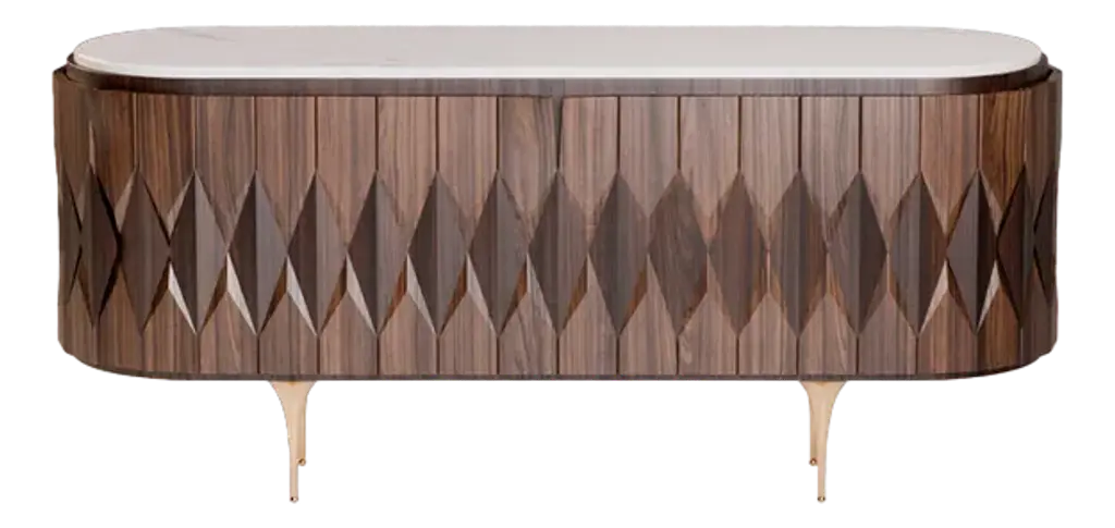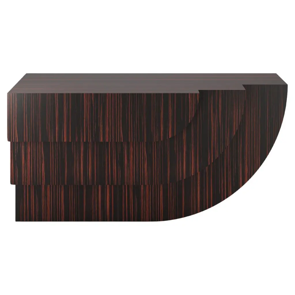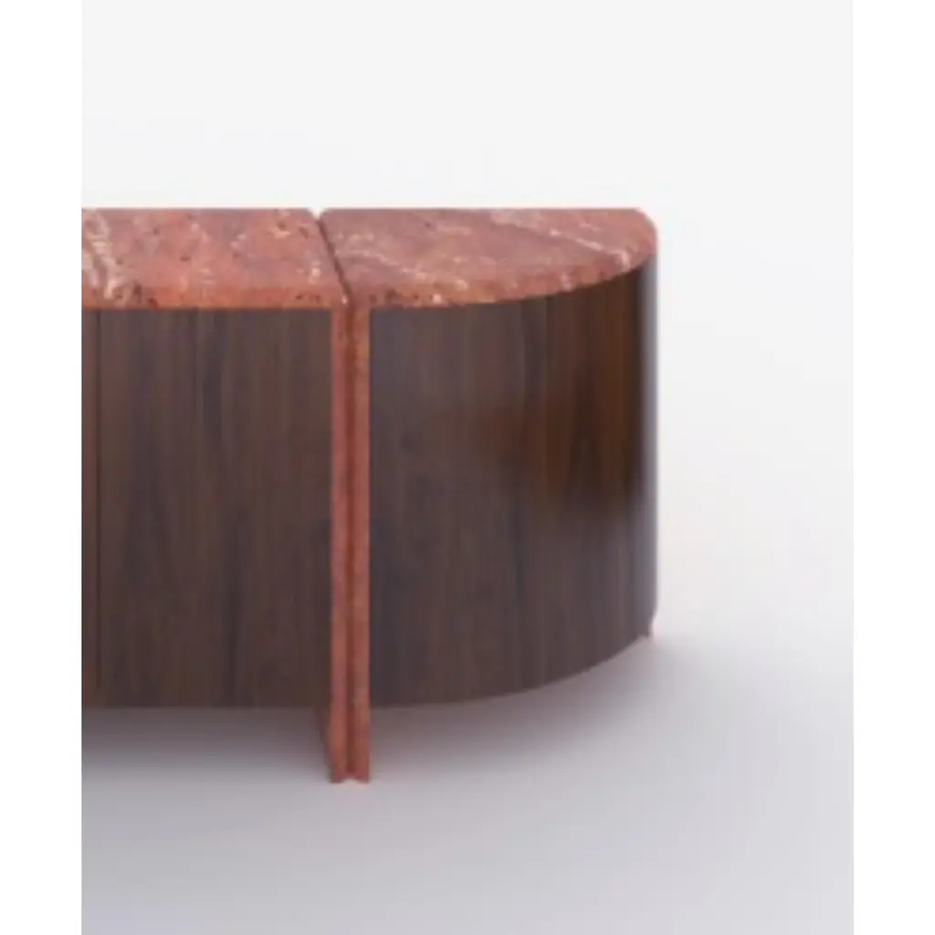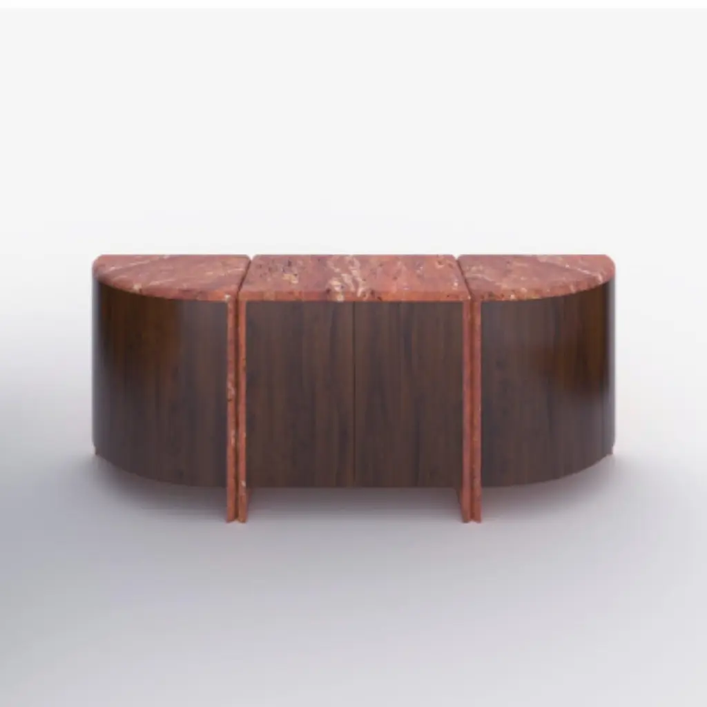 Red Travertine And Walnut Lily Credenza by Fred and JuulDimensions: D 43 x W 202 x H 78 cm.Materials: Red travertine and walnut.Fred&Juul, short for Federico Minarelli and Julie Janssen, are two architects who decided to work as architects isn’t for them. It was when designing custom furniture for their clients and developing it with the amazingly skilled local artisans that they truly found joy in their work. So, in 2012 they decided to focus solely on that and launched their first lighting and furniture collection. With the exception of the renovation of the old Tuscan farmhouse that would become their home and studio, a labor of sorrow, but mostly love (see the result on the press page!).What sets them apart is how they see and use their materials of choice: bronze, brass, wood, and stone. Their designs value the inherent nature of these materials and how they are meticulously crafted, like the grainy, clouded surface of their Raffaele light in sand-cast brass or the juxtaposed Oak grains in the marquetry of their Maurits table. Starring all these aspects in the story of a piece is what makes it unique and last.Over the years they have increasingly worked with interior designers on custom pieces for high-end projects all over the world, thanks to their attention to detail, refined aesthetic sense and collaboration with the best highly specialized craftsmen Tuscany has to offer.