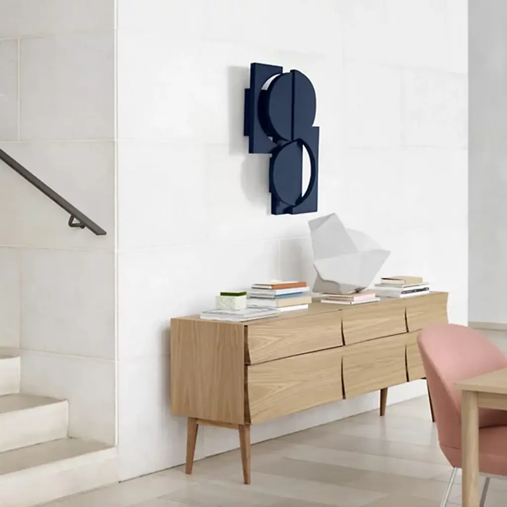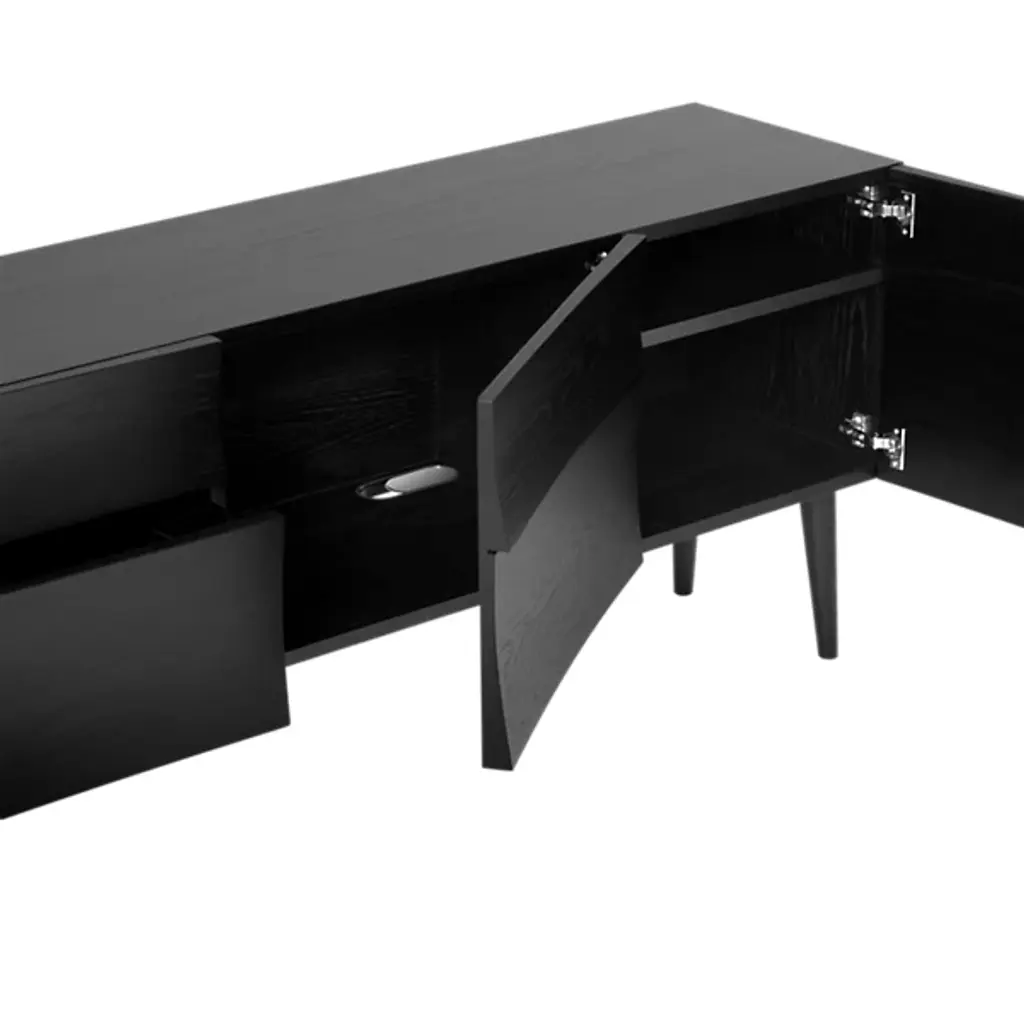 The Reflect Sideboard from Muuto expands inside spaces with style, storage, and subtlety in a signature Scandinavian style. Setting a smooth rectangular frame atop telescoping, slightly splayed legs, it presents a mid-century modern spirit simple enough to play well in commercial or business spaces. The sideboard’s front side is surfaced with a set of rectangular panels that decrease in width from left to right, featuring faces that curl out from the frame and offering the structure a fluid and intriguing character.