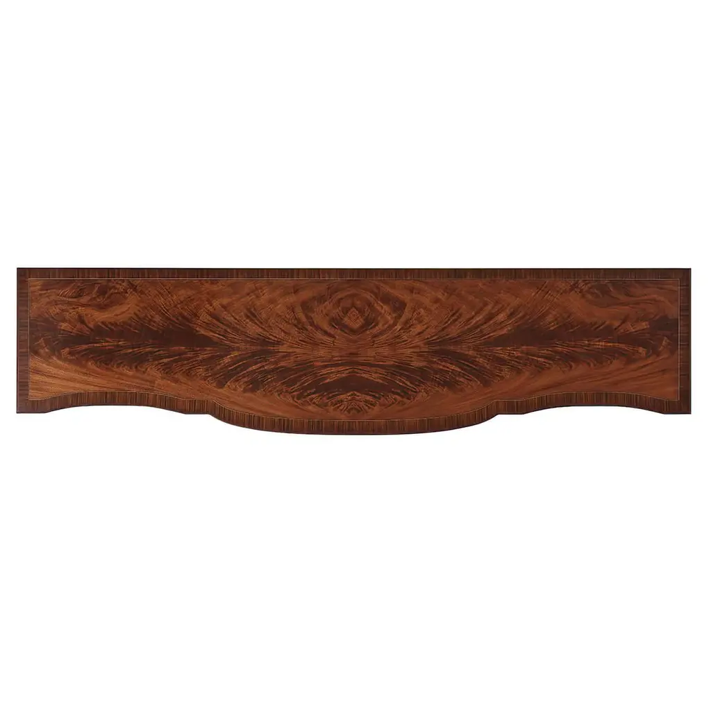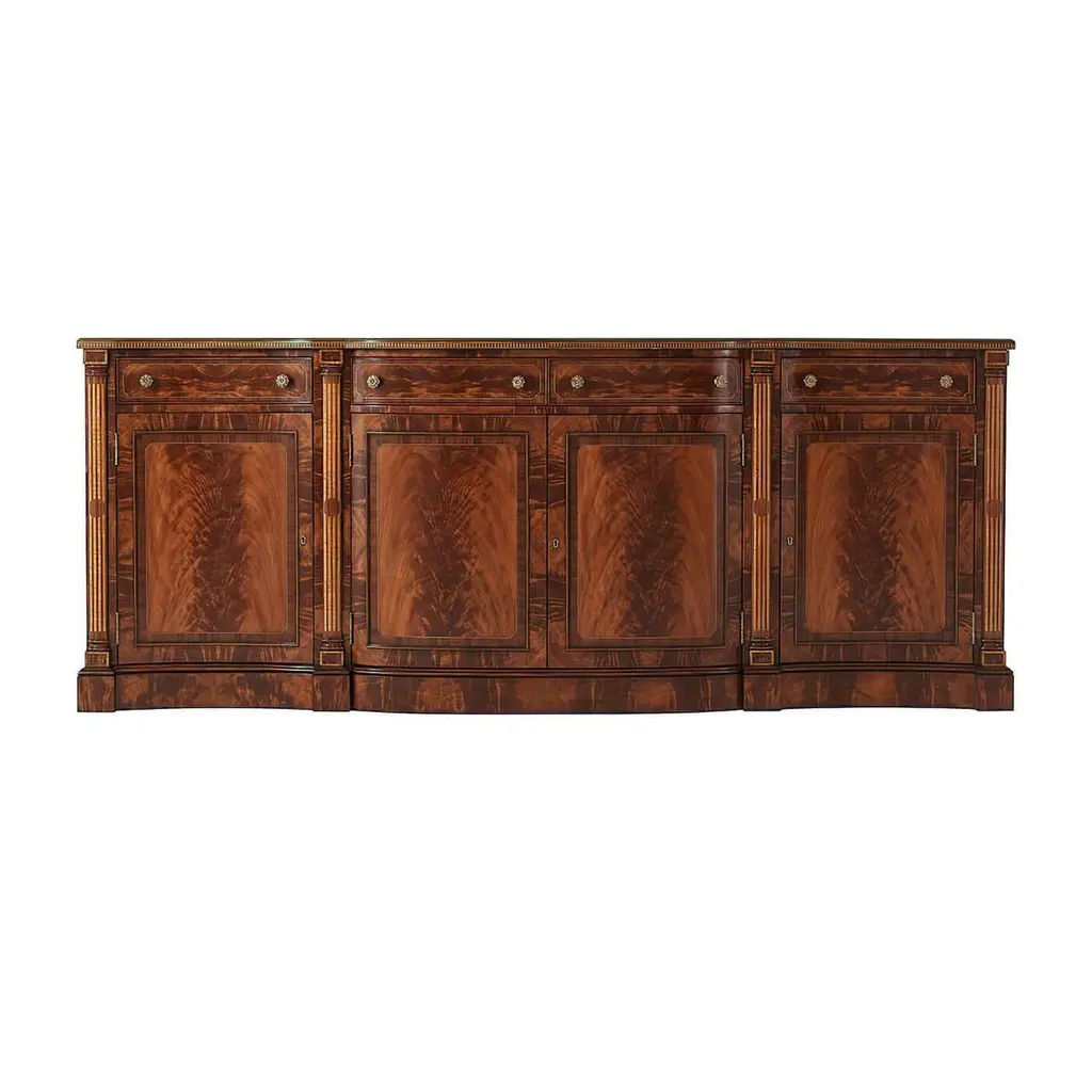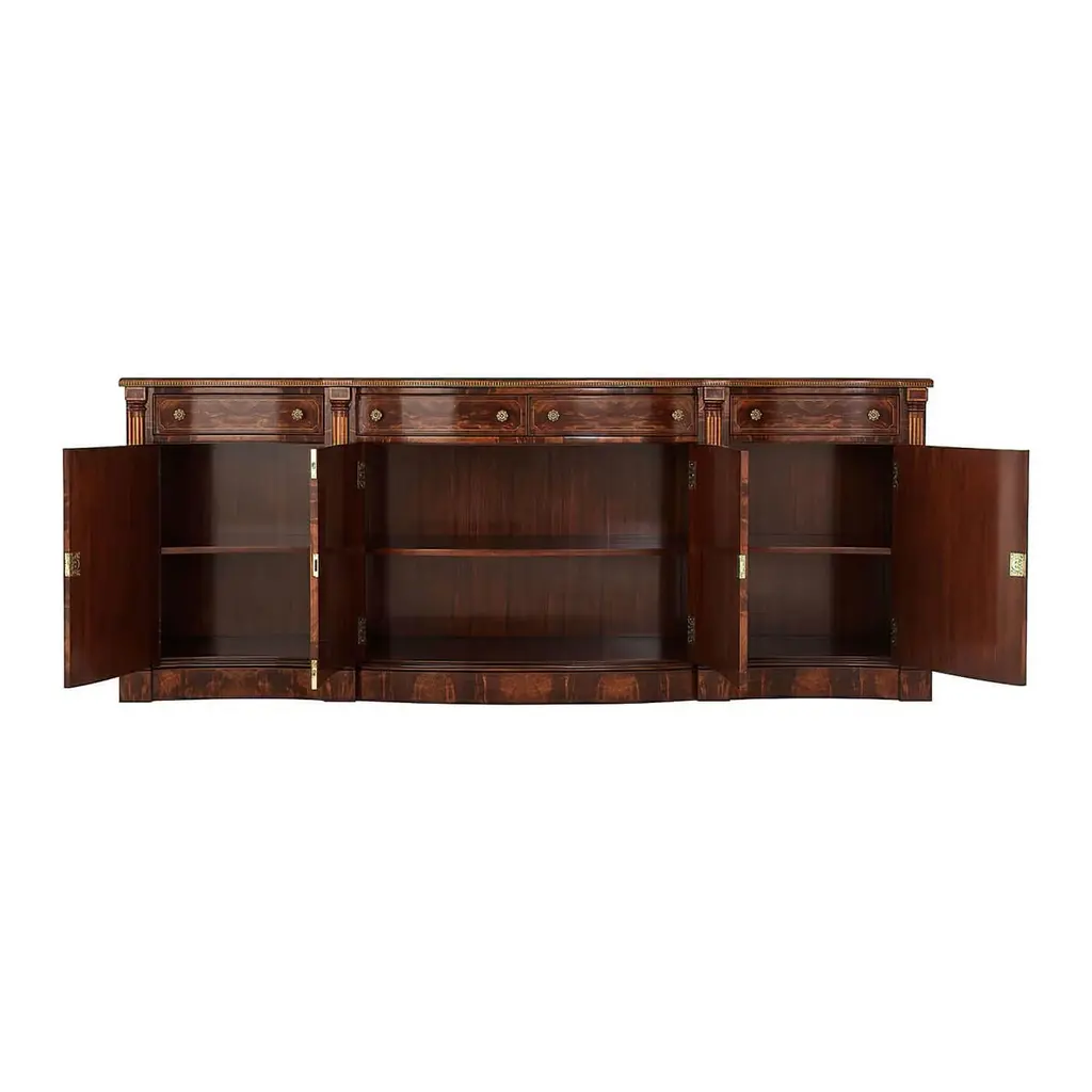 A fine Regency Serpentine credenza with flame mahogany and Morado banding, with Fine double stringing in sycamore and ebony, the serpentine crossbanded top above four frieze drawers, above four paneled cabinet and lockable cabinet doors flanked by fluted inlaid rounded columns, on a shaped plinth base.Dimensions: 89.5" W x 22" D x 36" HTypically ships in 24 - 28 weeks.