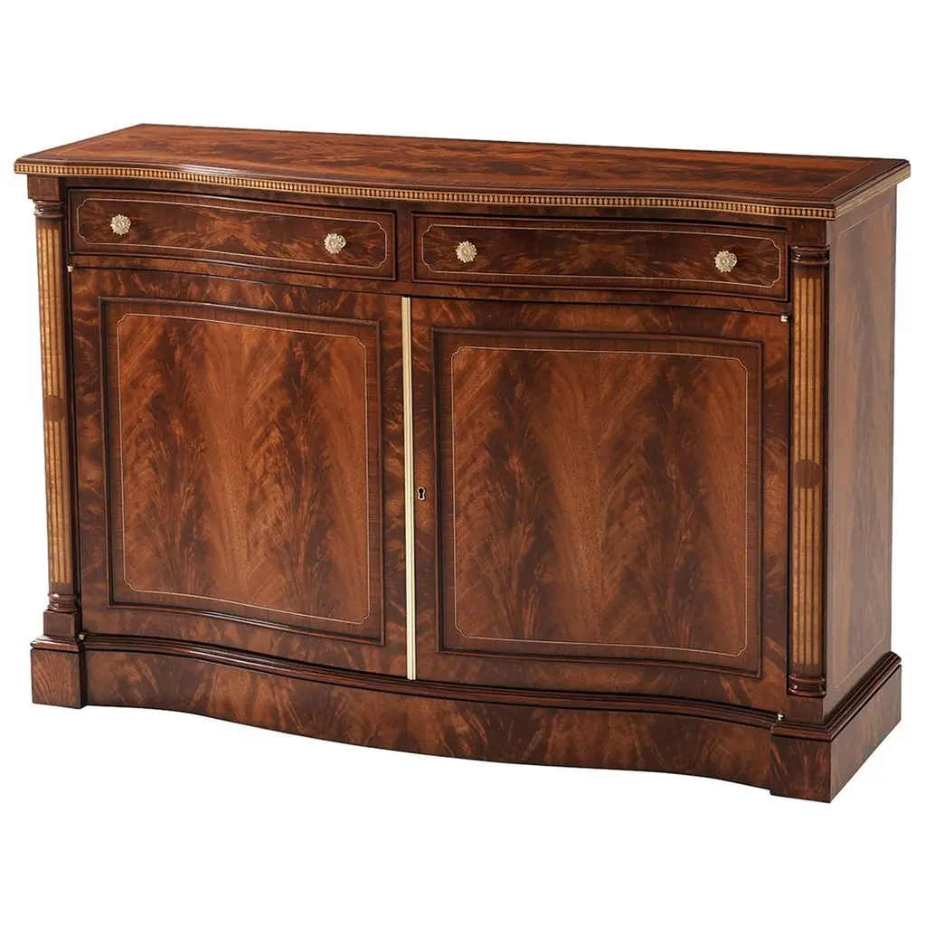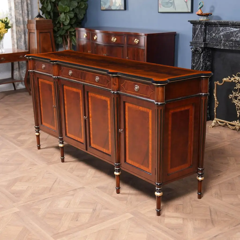 The Regency Sideboard draws it’s inspiration form the great homes in England during the reign of the Prince regent in the late eighteenth century. Our Regency Sideboard has it all with sophisticated design and practical storage. The fluted columns are a classic design feature and the rounded shape of the columns is highlighted on the top of the sideboard as well. Continuing down the piece the high quality dovetailed drawers are inlaid with fine satinwood veneers and the doors further below are banded with satinwood. The flowing and fluid appearance is carried on to the floor through the shaped and turned feet. High quality construction throughout the piece carries through to the solid brass designer quality hardware which is also shaped in a traditional Regency design.Measures 76″w x 22″d x 39.5″h