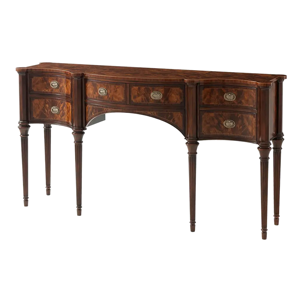 A Regency style mahogany and okum veneered line strung sideboard, the serpentine rosewood crossbanded top with protruding corners above turned uprights and tapering fluted legs, the central double-fronted frieze drawer above an arched apron, flanked by two concave fronted drawers, on turned tapering legs.Dimensions: 68" W x 17.75" D x 37.5" H.