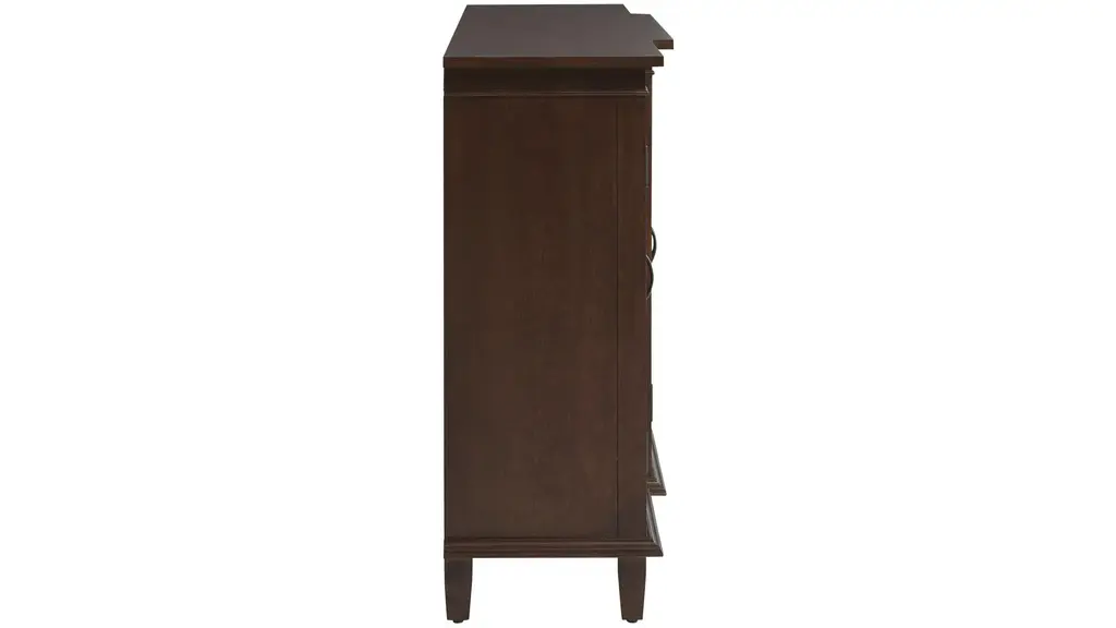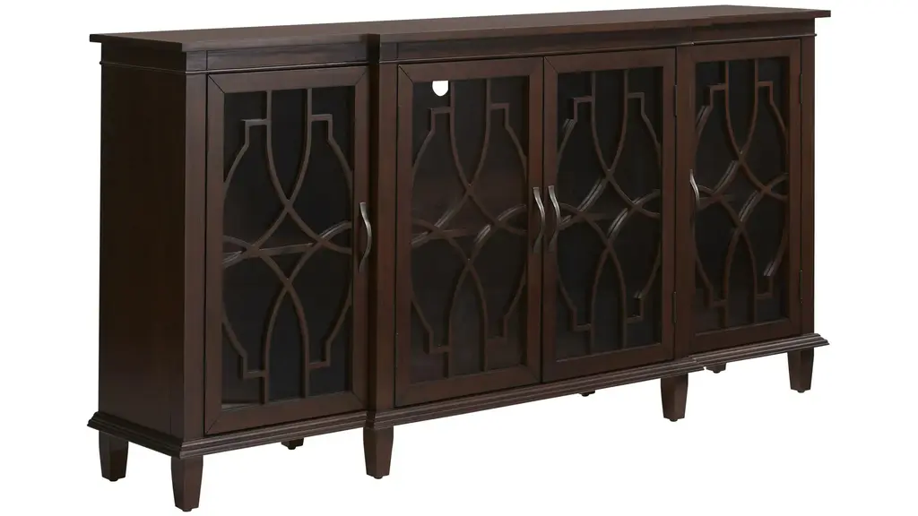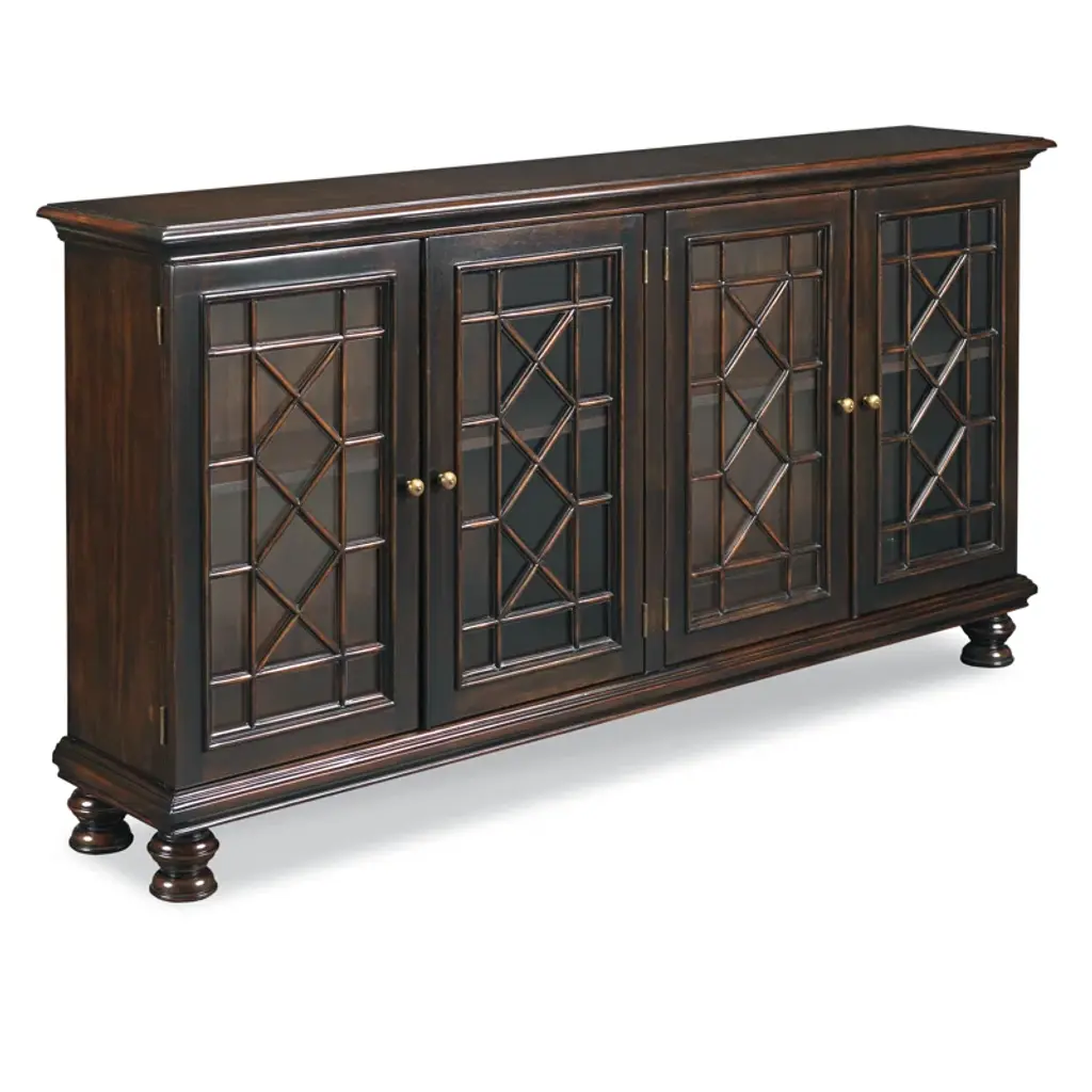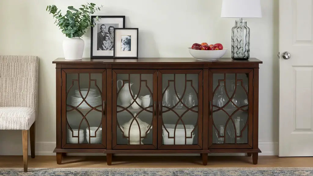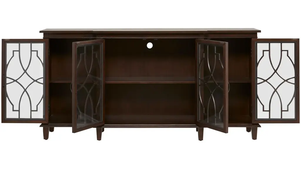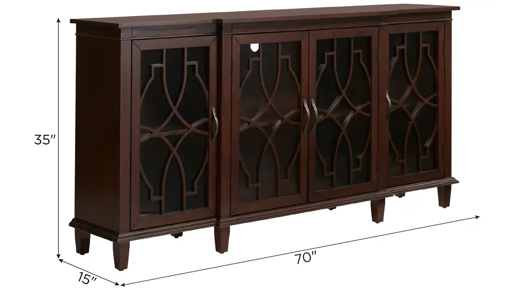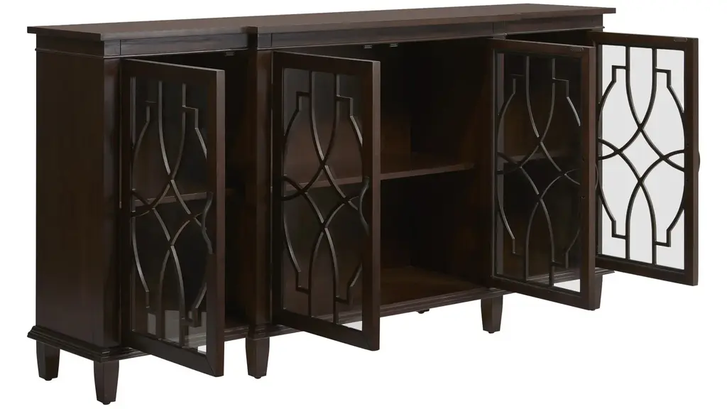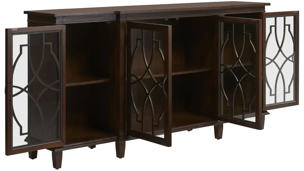 Welcome timeless style, warmth, and functionality with the Regina Accent Sideboard. Beautifully detailed glass-panel doors open to four cabinets with split-level shelving that offers plenty of storage and display space for an entryway, dining area, or den. You simply can't go wrong with this elegant transitional style.