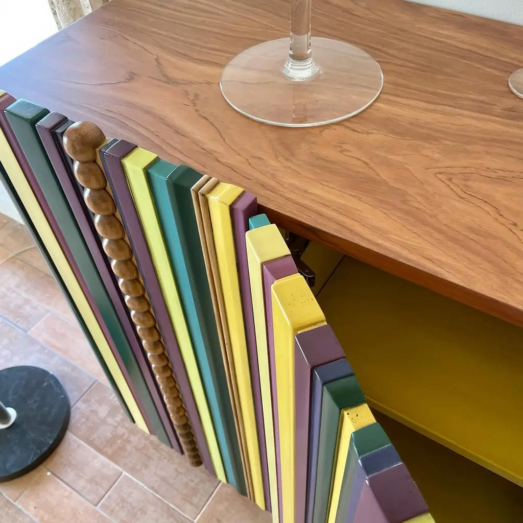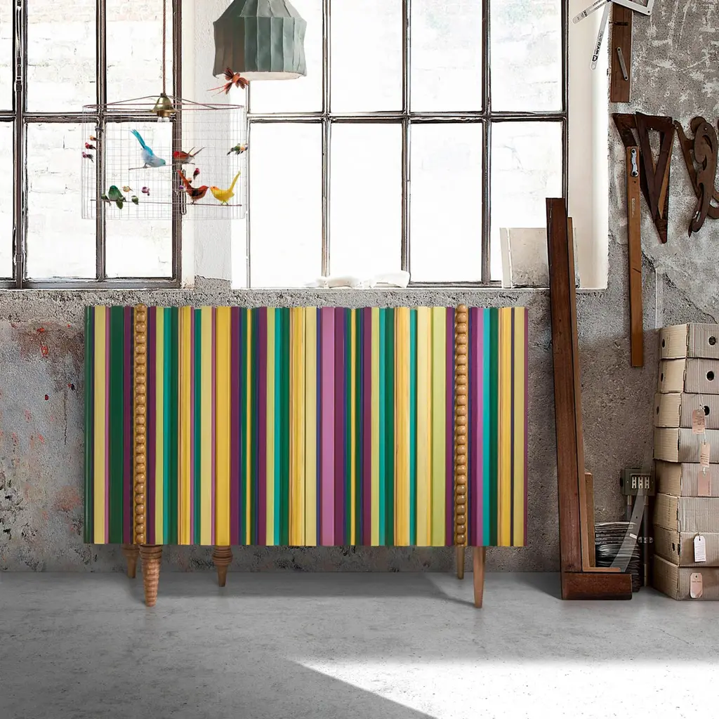 Reina Sideboard 160, Four Doors, by Lola GlamourDimensions: D 45 x W 160 x H 110 cmMaterials: Wood.The multiple possibilities of the Reina series have inspired us to create furniture suitable for any room. Each piece takes on an entity in itself, being reinforced in its original color combination, here mainly with striking yellow, violet, and green tones, both for the exterior and to cover the interior shelves.This colorful sideboard hides a large capacity among its carvings and slats, with four doors with two shelves inside each one.Customizable in finish and size.We are Félix and Désirée Ramos, brothers and product designers of our brand, Lola Glamour.We are interested in the singular, the different, the beauty, and the balance of color and materials. We have the ability to observe and the ability to translate any beautiful object into a piece of furniture.We are proud of having created our own style, a way of understanding design, which allows us to tell stories and connect with the souls of people and spaces.Lola Glamor is a Spanish company from Soria, which has designed and manufactured unique furniture in noble woods, with artisanal construction and extraordinary finishes since 1995. Artistic furniture that is customized in size and finish according to the client's needs.We offer original furnishing solutions for professionals and individuals from any country in the world, mixing materials, volumes, motifs, and colors that achieve their own style.We are, above all, the sum of a team of people who contribute their dedication and commitment to a unique level of demand, detail, and quality.