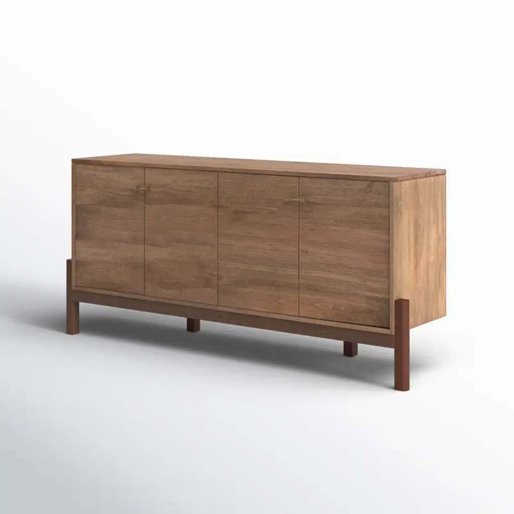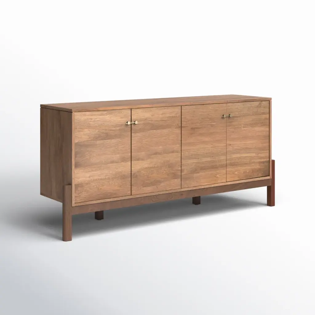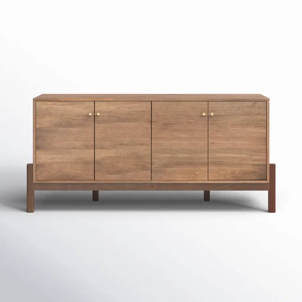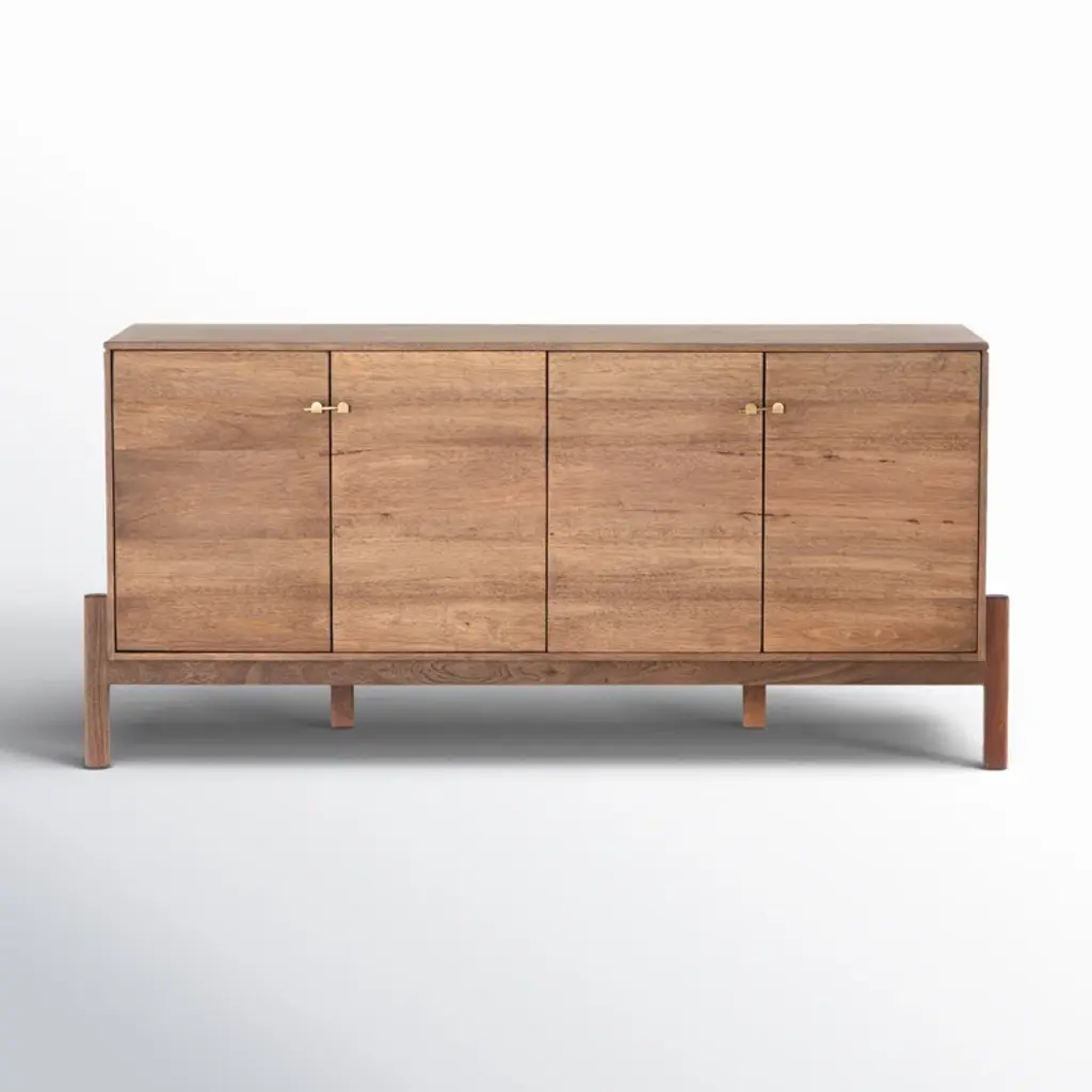 This stately sideboard has mid-century style with a Shaker-inspired spirit. It's made from solid and engineered wood with a light smoked honey finish. The clean-lined console table sits in an arched cradle based made from toasted acacia wood for a subtle, yet crisp, contrast. Twist-lock metal hardware adds a clever finishing touch. And, it even has rear cutouts for cord management, plus adjustable shelves complemented by soft-close doors. Plus, the finished back means you can add it anywhere, not just up against a wall.