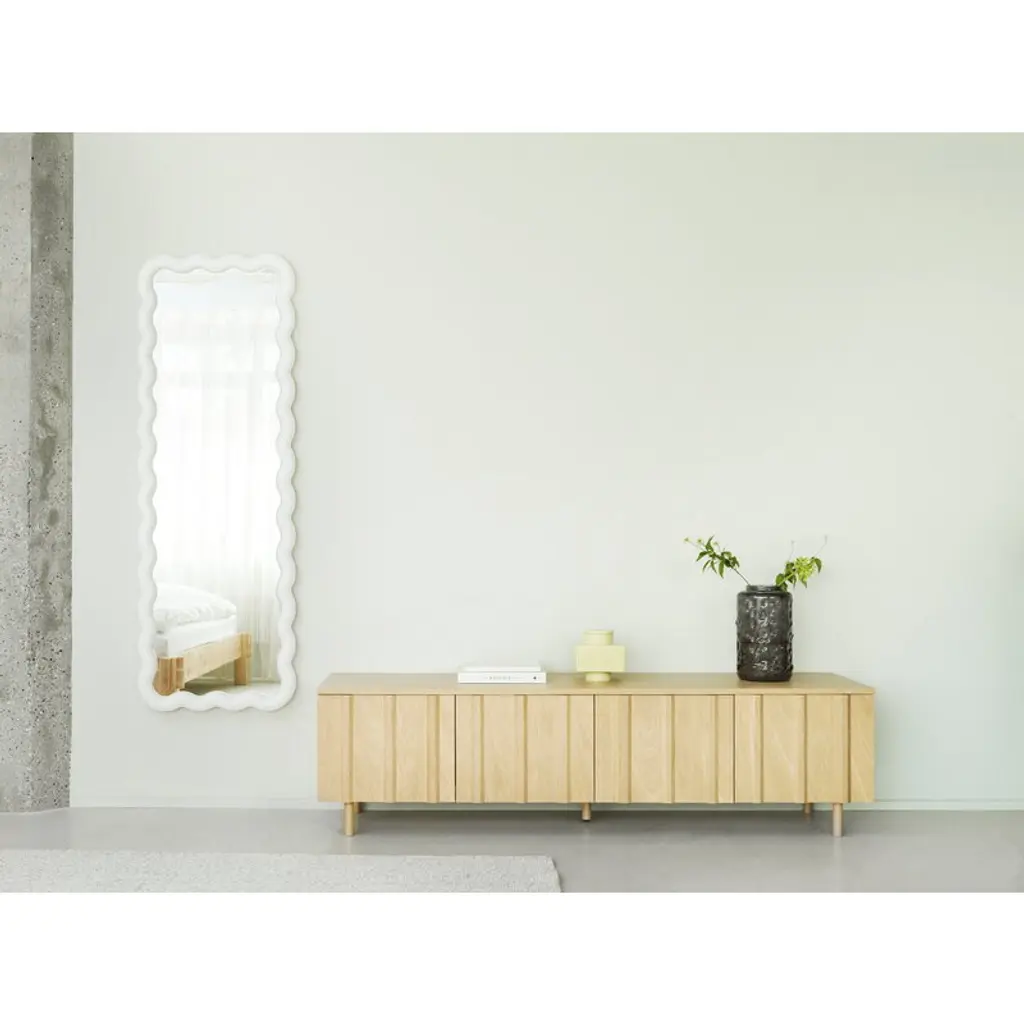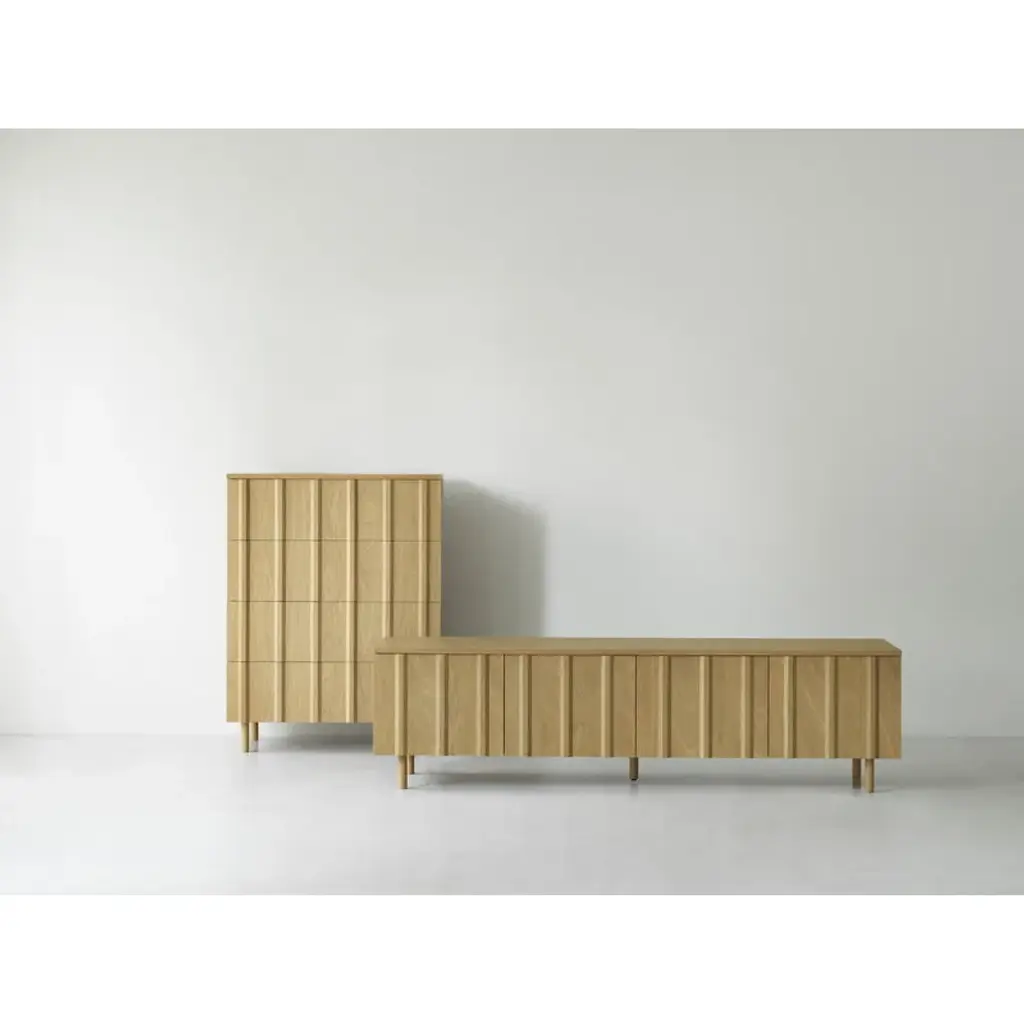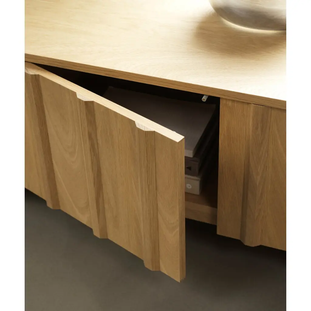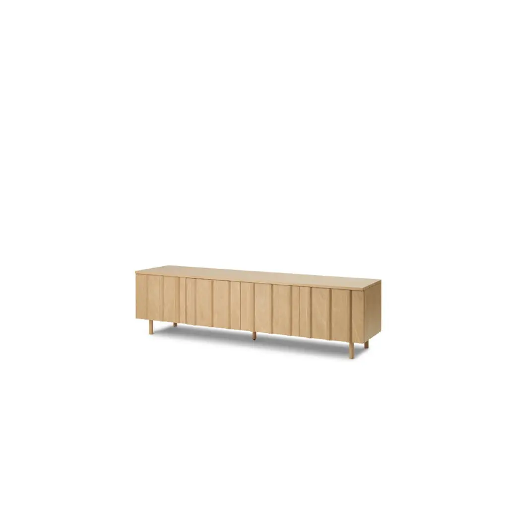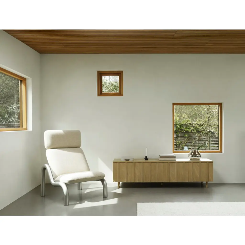 The Rib sideboard by Normann Copenhagen boasts a timelessly minimalist design inspired by the architecture of Nordic summer houses. Designed by Simon Legald, the oak-veneered sideboard is decorated with wooden slats that resemble the cladding of a sommerhus, stuga or kesämökki. Thanks to the push-open latches on the doors, the sideboard has no handles, making the overall design as harmonious as a breezy summer’s day spent idling away at the vacation home. The low Rib sideboard can be used as a TV stand in the living room or as a hallway storage solution for all your everyday essentials. The shelves are removable and adjustable.