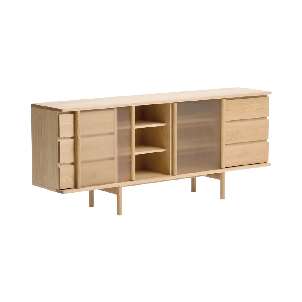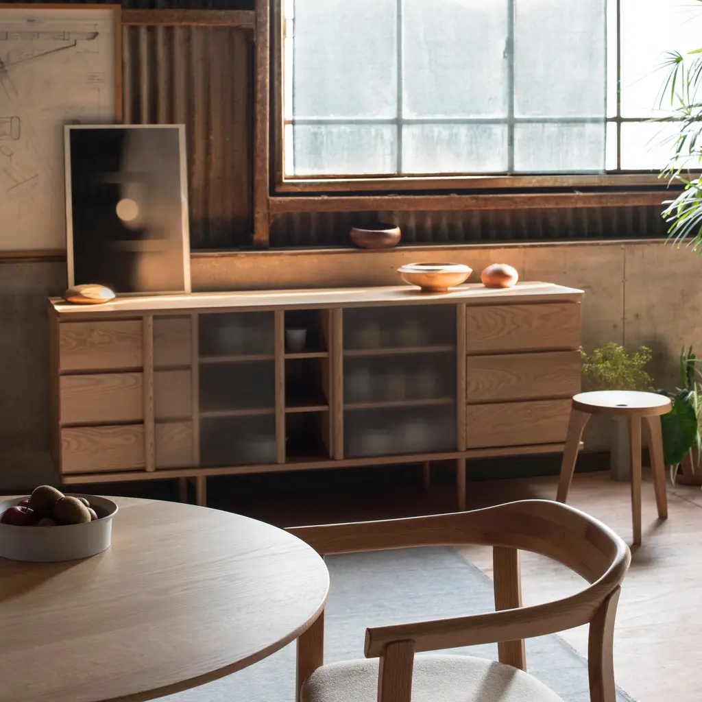 Gabriel Tan’s design for a wooden sideboard is inspired by traditional Japanese houses built on stilts and with sliding tatami doors, reflecting the importance of precision and harmony in that country’s architecture. To wit: Rikyu’s handles and legs are visually aligned when its glass doors are either fully opened or closed and the storage piece is constructed in solid oak or ash in a selection of finishes.