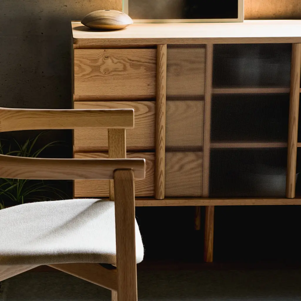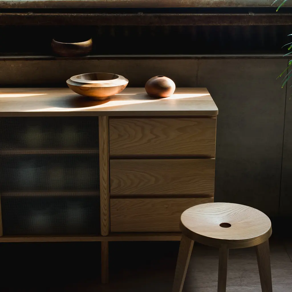Gabriel Tan’s design for a wooden sideboard is inspired by traditional Japanese houses built on stilts and with sliding tatami doors, reflecting the importance of precision and harmony in that country’s architecture. To wit: Rikyu’s handles and legs are visually aligned when its glass doors are either fully opened or closed and the storage piece is constructed in solid oak or ash in a selection of finishes.