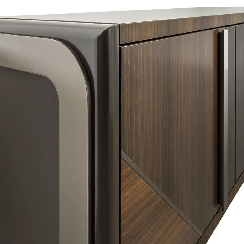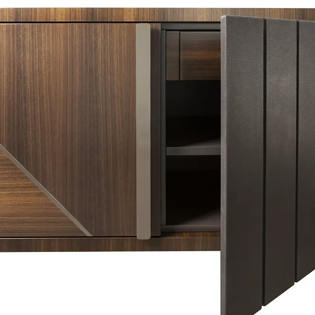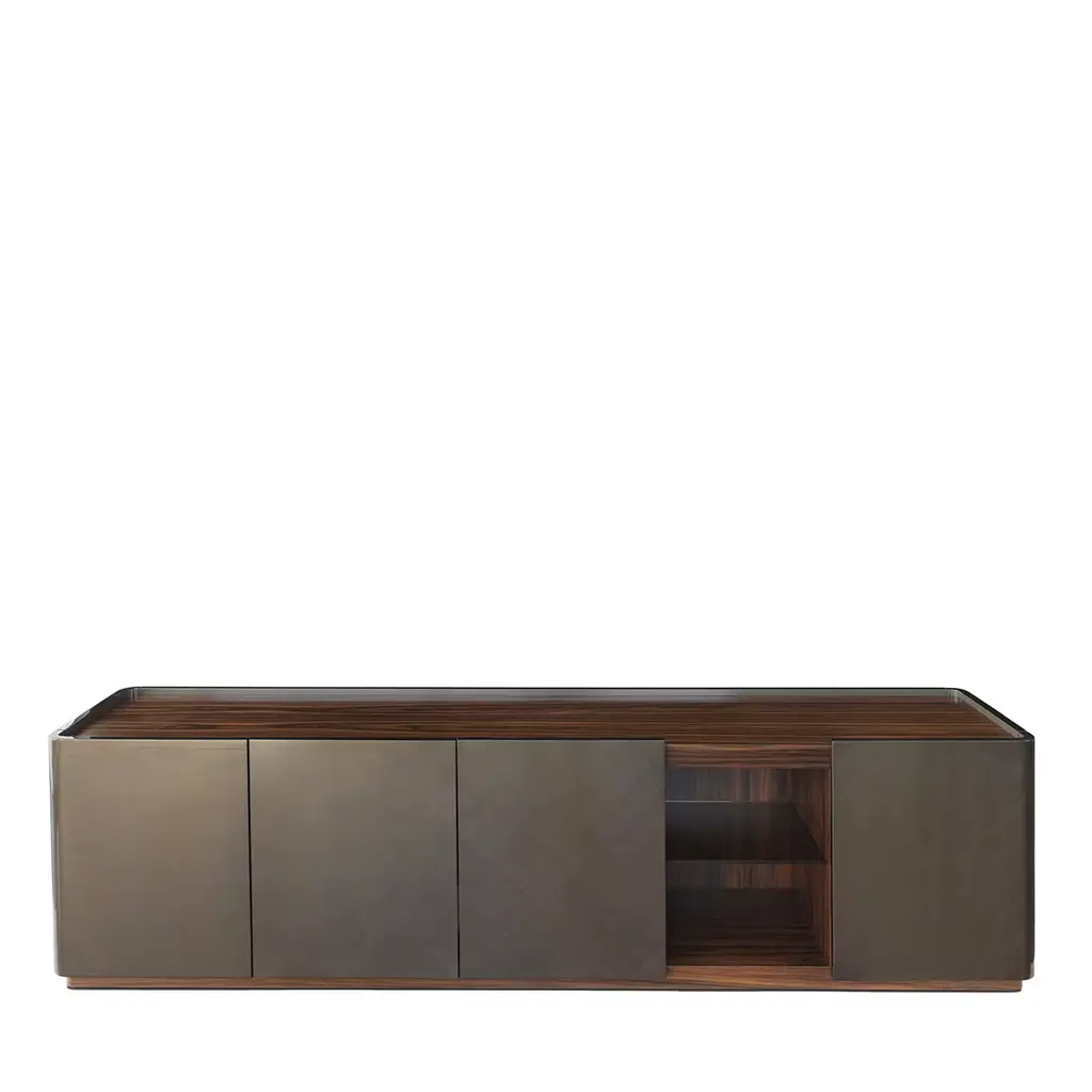 Part of a small collection of complementary styles, the Ring Credenza is named after its side supports. Accented with lacquers, leathers and glistening metal parts, the credenza stands out for its dramatic wood tones. The credenza conceals shelves and two central drawers, making it easy to organize and store dishes away.