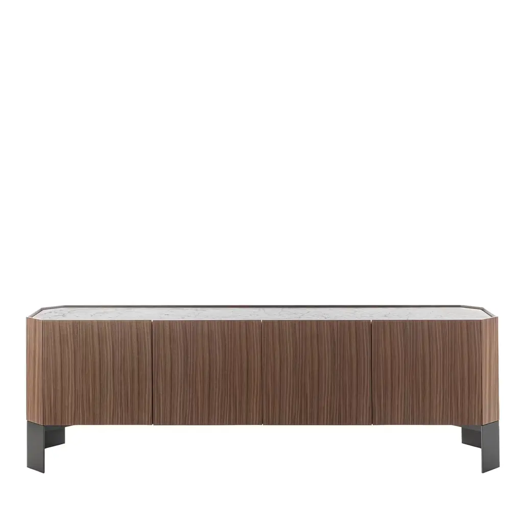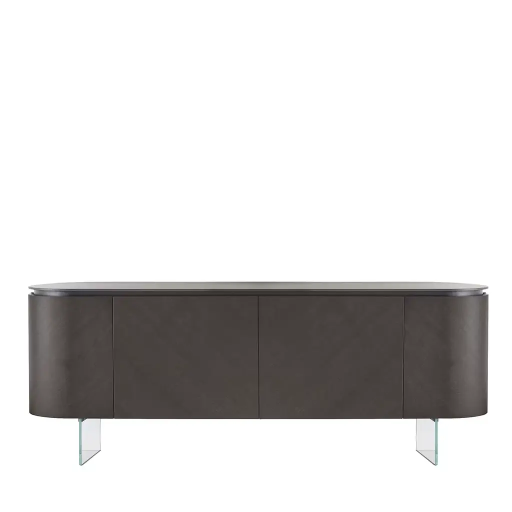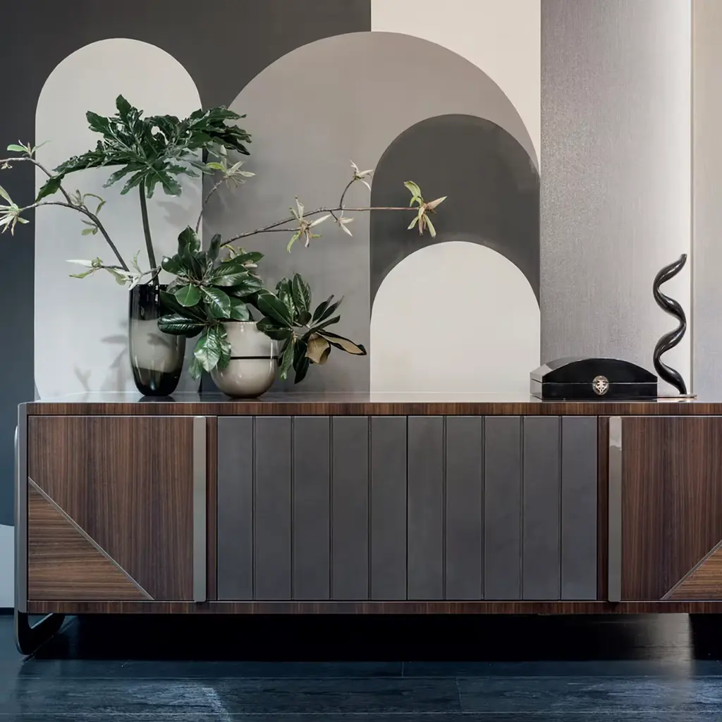 Part of a small collection of complementary styles, the Ring Credenza is named after its side supports. Accented with lacquers, leathers and glistening metal parts, the credenza stands out for its dramatic wood tones. The credenza conceals shelves and two central drawers, making it easy to organize and store dishes away.