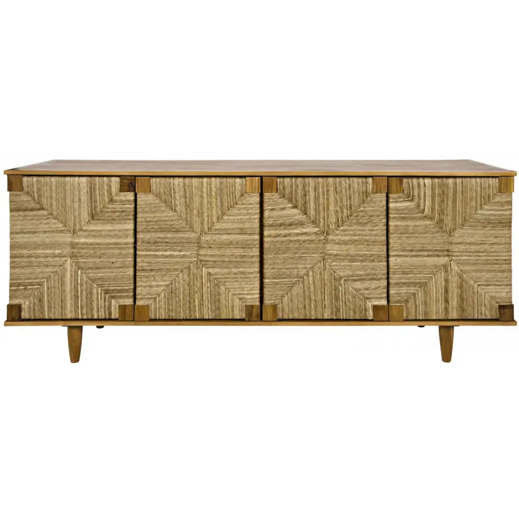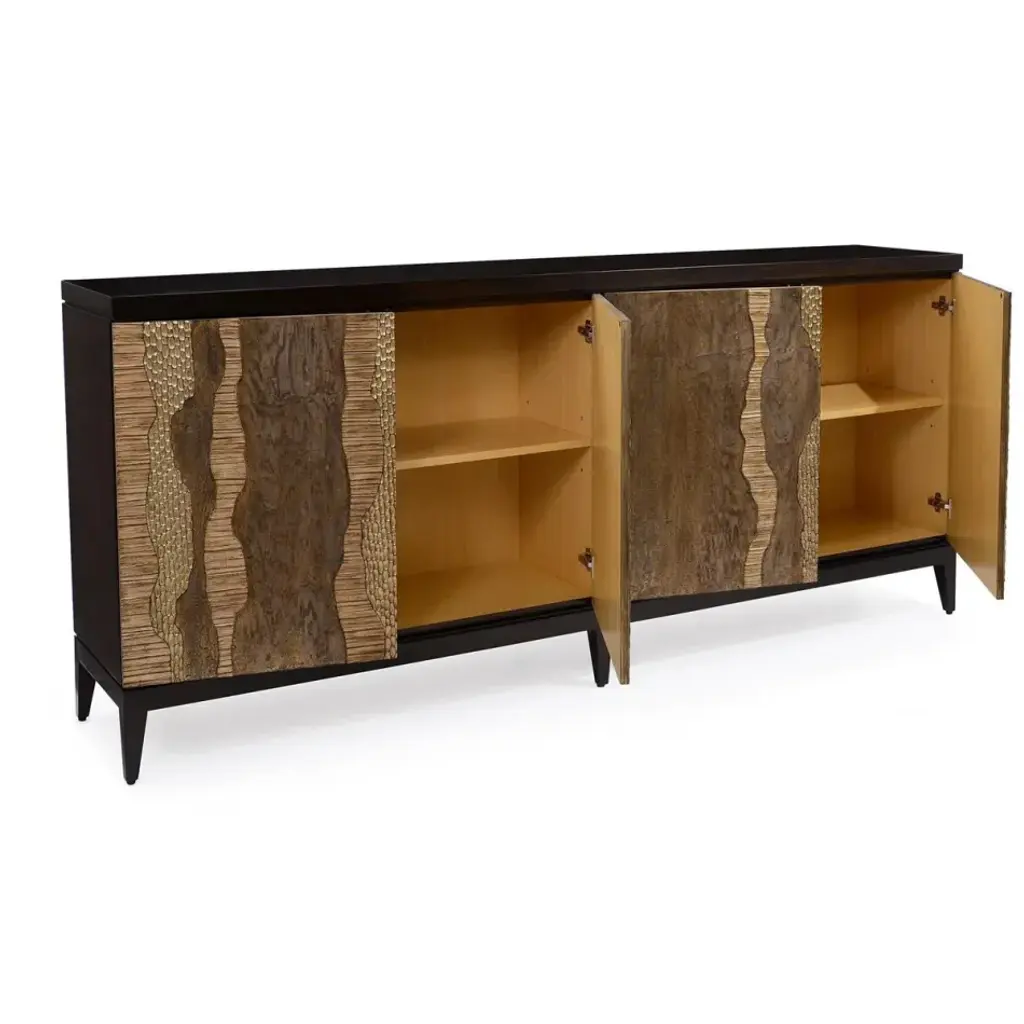 This gorgeous sideboard features an espresso finish. The four door fronts showcase linear striations with multiple textures in a finish of rose silver cerusing and tamo ash walnut.