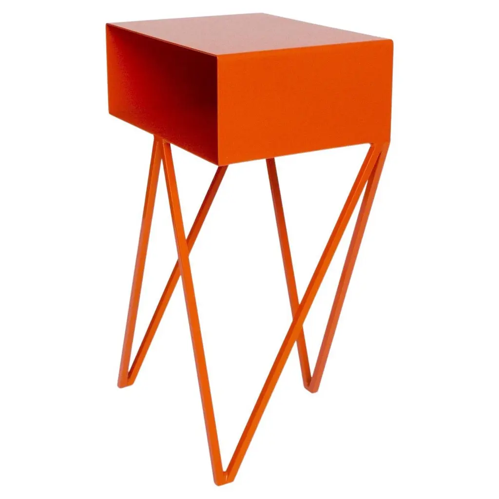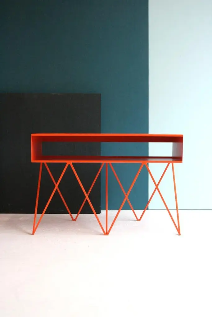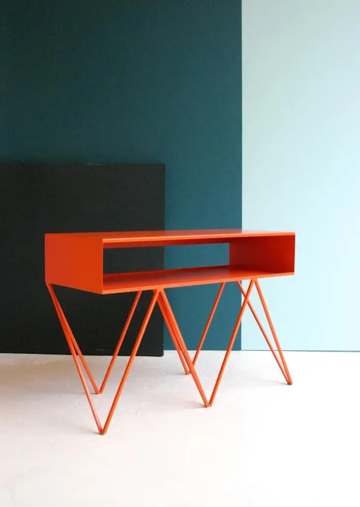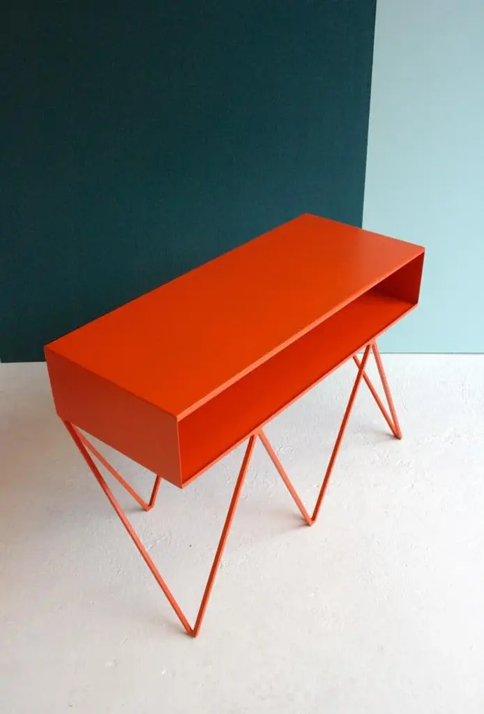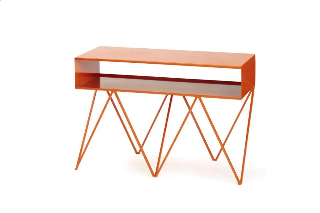 The sculptural low steel sideboard Robot Too is great as a media/AV stand. The slim pigeonhole shelf on top has a clever half-open back to hide wiring and leads. This one is powder coated in orange. All &New products are manufactured in Britain in small batches. They have plenty of character as every weld is different. The result is a collection of furniture that celebrates those little imperfections that make objects beautiful. Measurements: 90cm wide, 37cm deep, 61cm high. 17cm shelf height. Labeled by Maker,Labeled by Maker