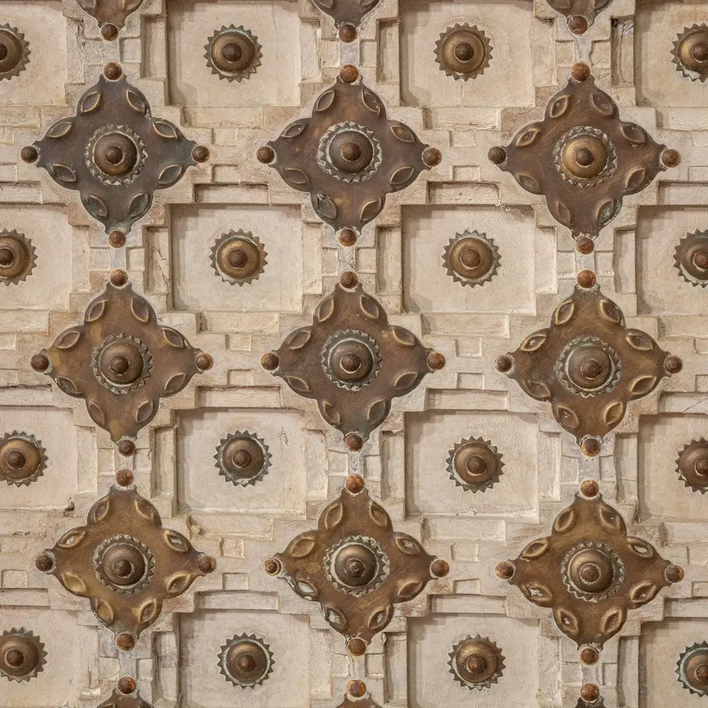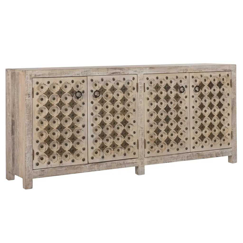 Carved reclaimed wood four door sideboard with carved dimensional boho/Aztec inspired design and antiqued brass finish metal diamond overlay. Antique white washed finish on wood. Each may vary in exact coloring, wood grain, and natural imperfectons. Weighs approx. 200 lbs.