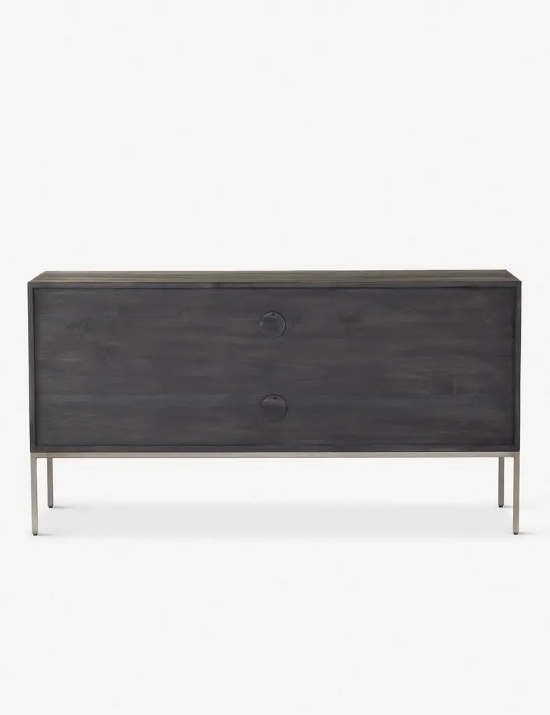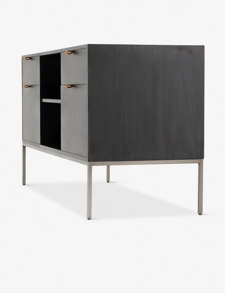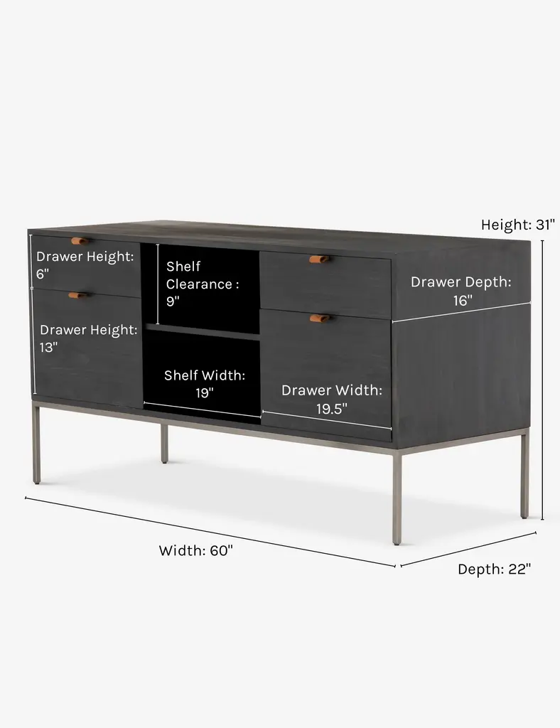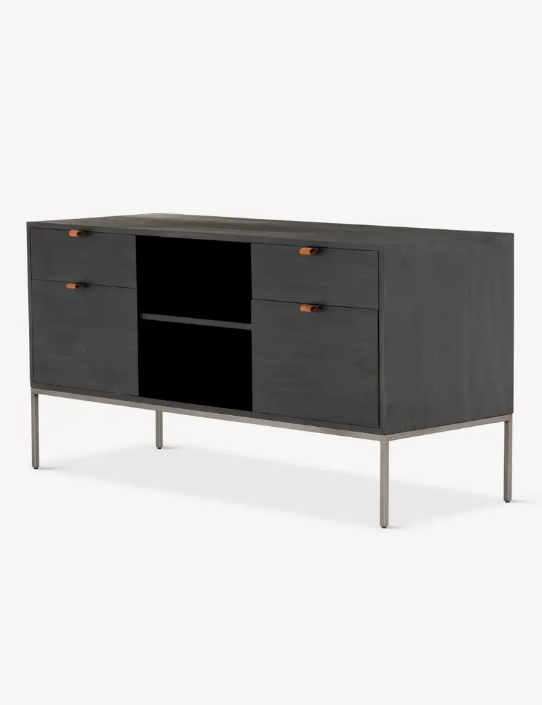 Keep your office style grounded (and super organized) with this wooden filing console. Features elements of mid-century aesthetics like a black wash, slim iron base, and top-grain leather drawer pulls.