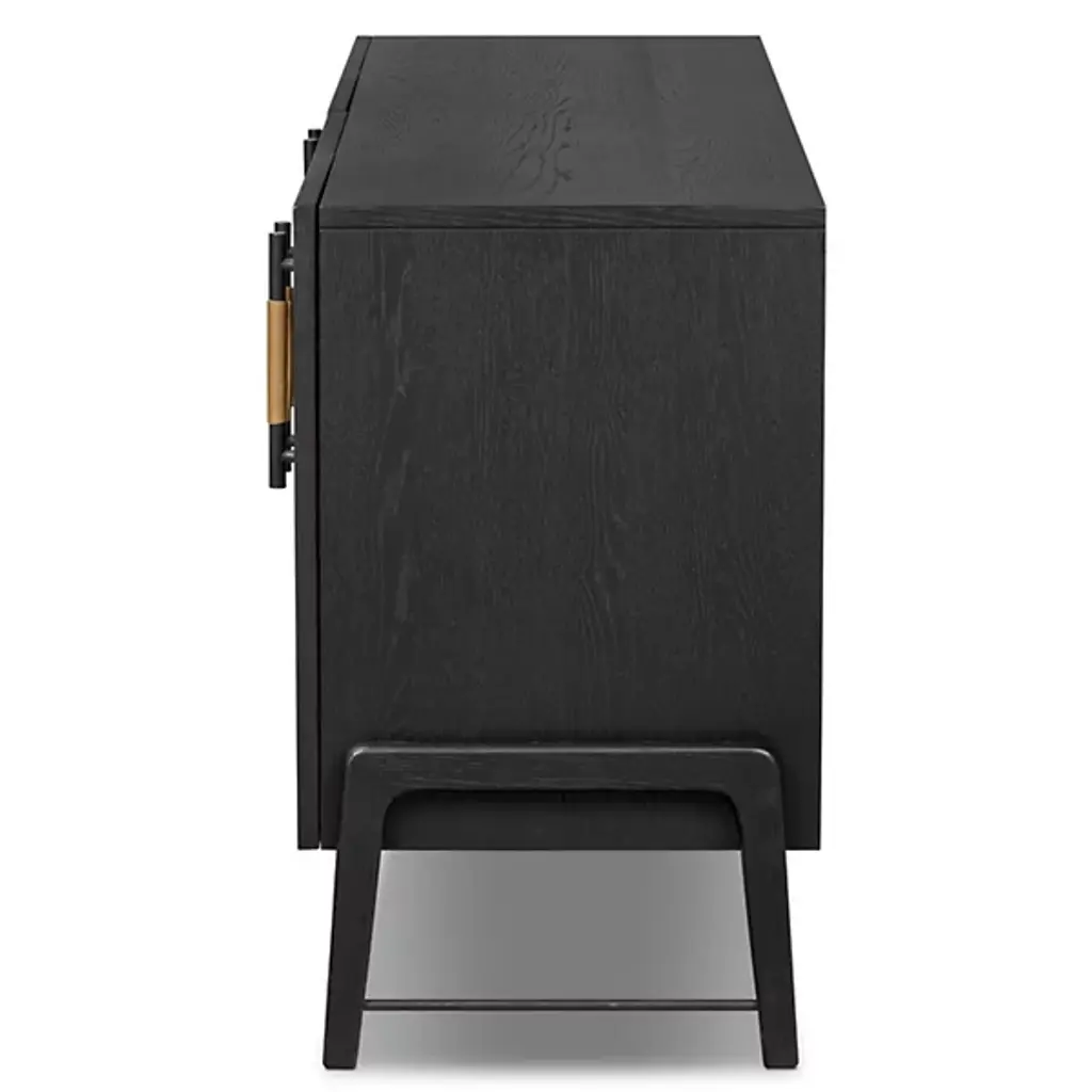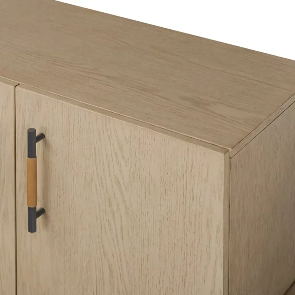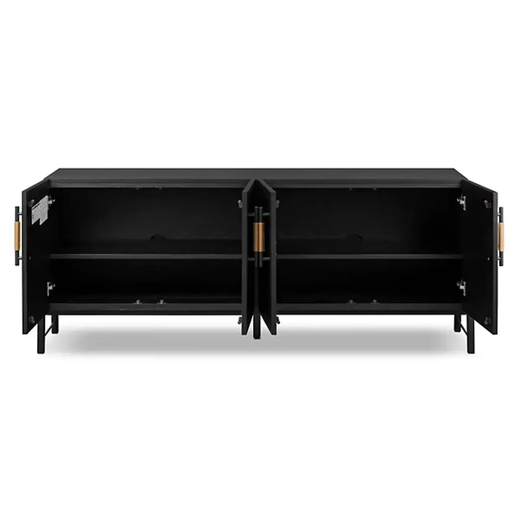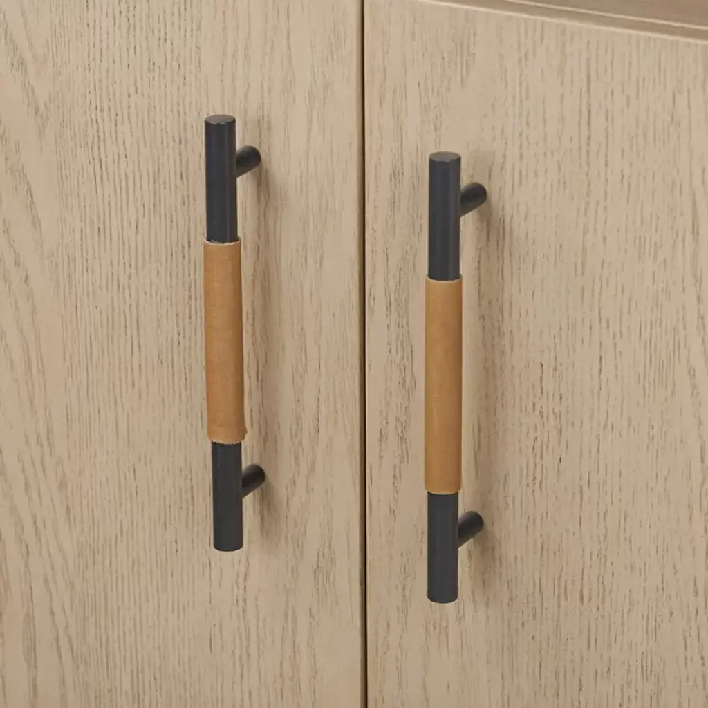 The Rosedale Sideboard from Four Hands combines sleek design with practical elegance. Crafted from black-finished oak veneer, this piece showcases a clean, modern silhouette accented by doors opened via iron handles wrapped in luxurious top-grain leather. Outset legs provide a touch of visual intrigue, while spacious interior shelving offers ample storage for your essentials. Thoughtfully designed with rear cutouts for easy cord management, the sideboard blends style and function, making it a sophisticated addition to any contemporary space.