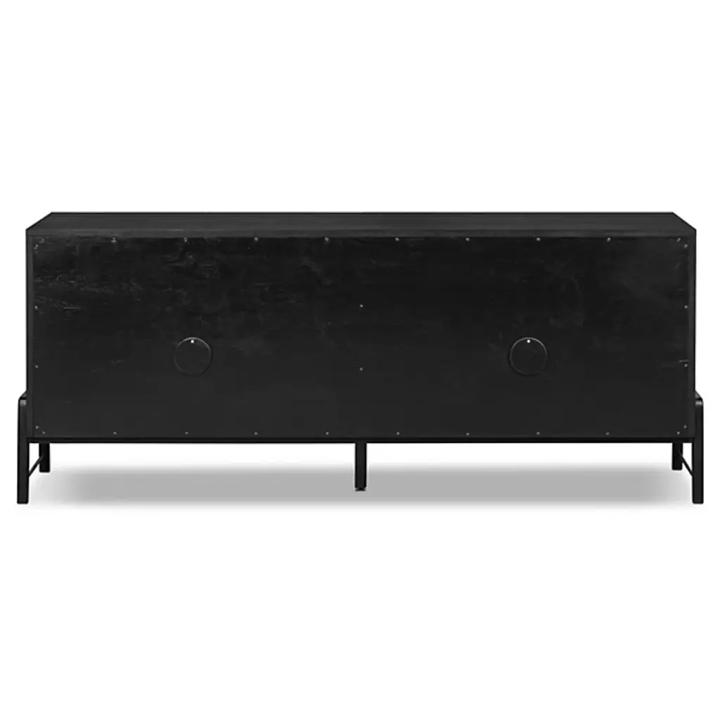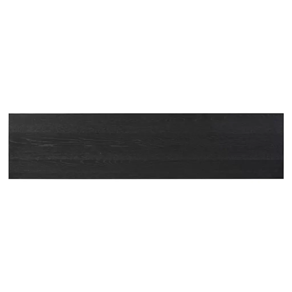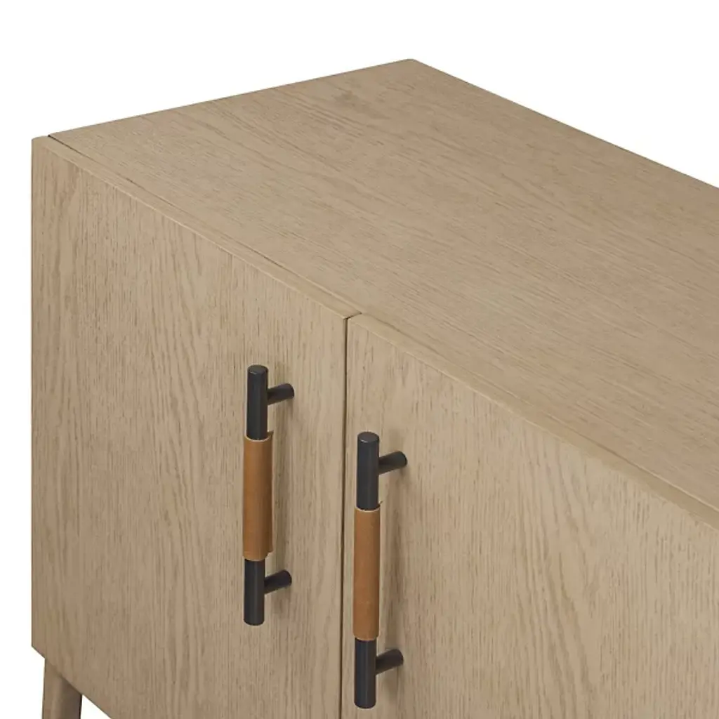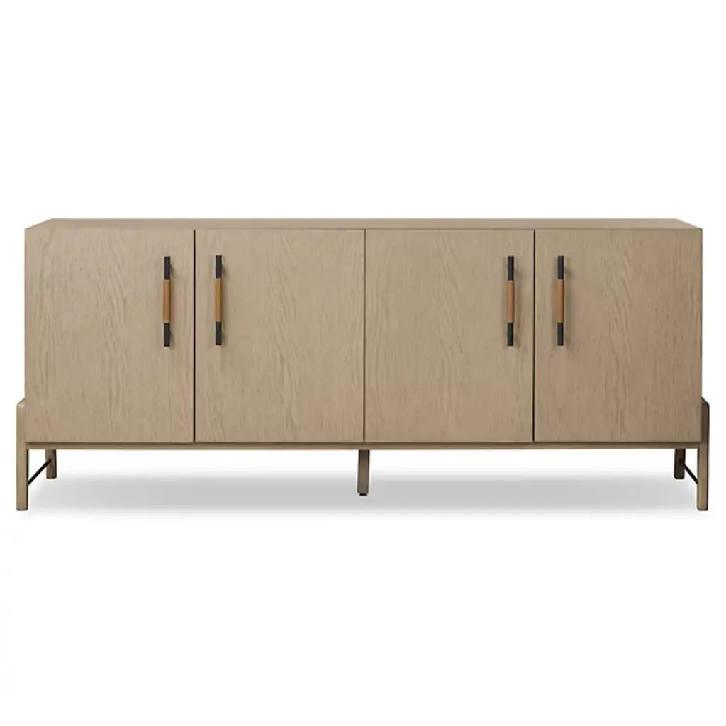 The Rosedale Sideboard from Four Hands combines sleek design with practical elegance. Crafted from black-finished oak veneer, this piece showcases a clean, modern silhouette accented by doors opened via iron handles wrapped in luxurious top-grain leather. Outset legs provide a touch of visual intrigue, while spacious interior shelving offers ample storage for your essentials. Thoughtfully designed with rear cutouts for easy cord management, the sideboard blends style and function, making it a sophisticated addition to any contemporary space.