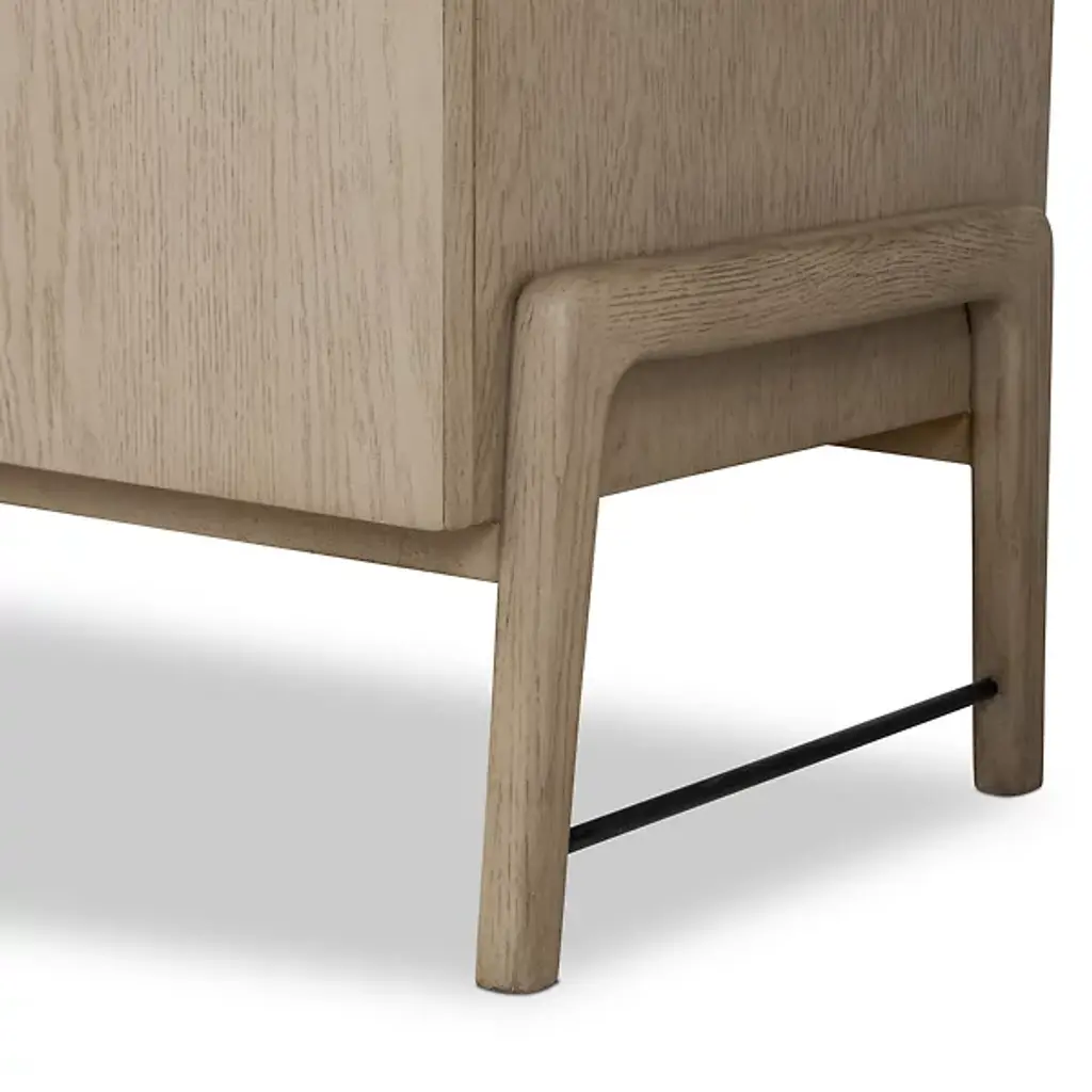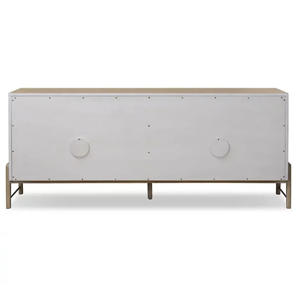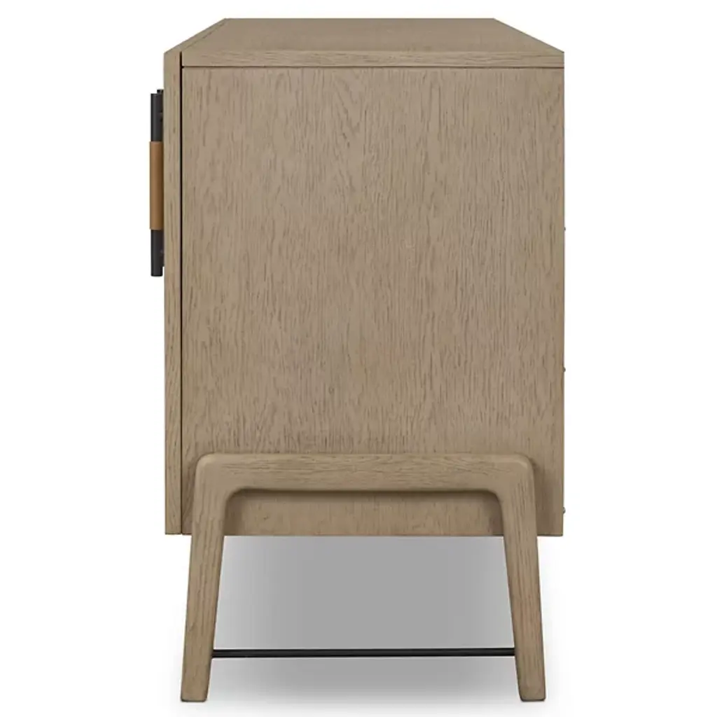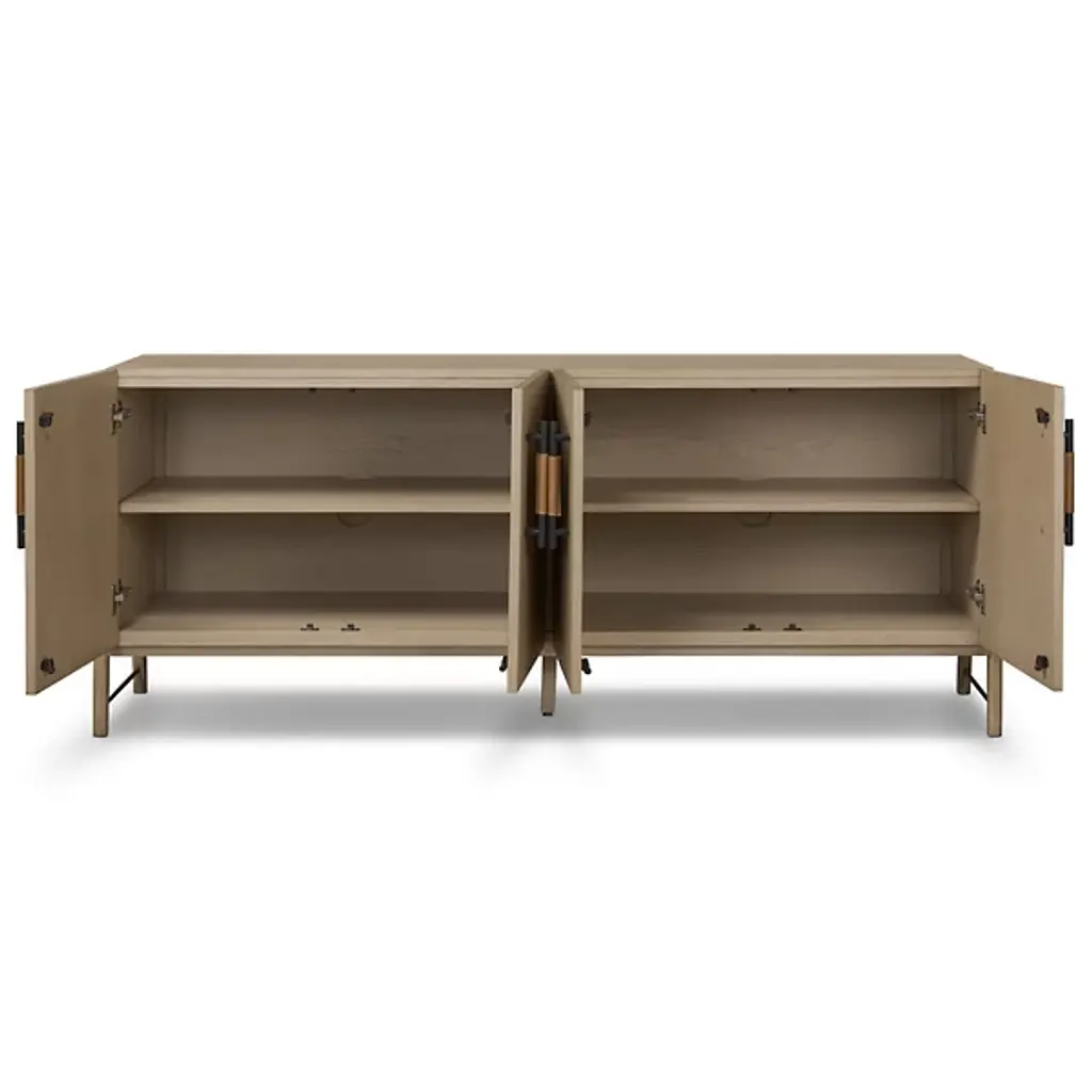 The Rosedale Sideboard from Four Hands combines sleek design with practical elegance. Crafted from black-finished oak veneer, this piece showcases a clean, modern silhouette accented by doors opened via iron handles wrapped in luxurious top-grain leather. Outset legs provide a touch of visual intrigue, while spacious interior shelving offers ample storage for your essentials. Thoughtfully designed with rear cutouts for easy cord management, the sideboard blends style and function, making it a sophisticated addition to any contemporary space.