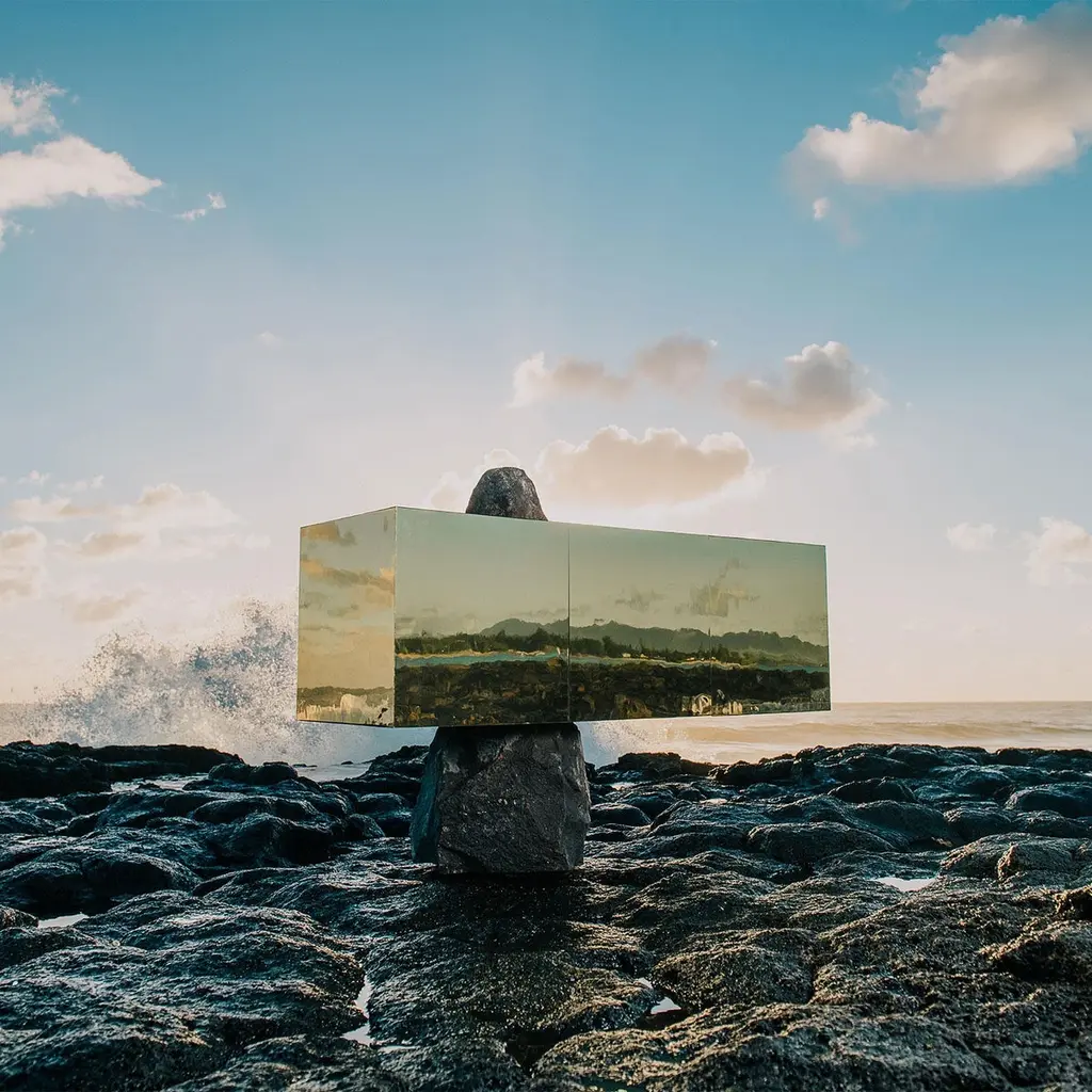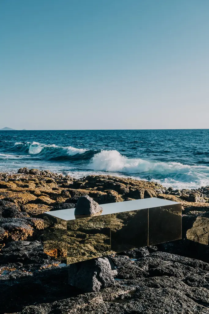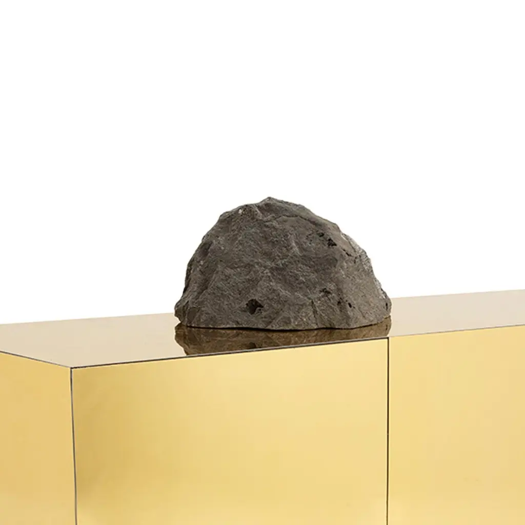 Designed by Francesco Maria MessinaOdyssey collection aims to surprise and to astound through the contrast between the Natural elements and man-made materials that merge into one another, without blending. The virtually impossible balance of the cabinets on top of the stones, their spin and dynamism represent disorientation during the voyage, the journey and the odyssey in the deep ocean. The mirrored surfaces recall the ocean surface.The last surprise comes from the cabinet’s interiors that are lined in premium gleaming leather.Sideboard made of gold mirrored acrylic and aluminum lining and supported by a Natural Lava Stone. Internal part in genuine gold Italian leather. Lava stone lighted via hidden led strip at bottom of furniture.Available in silver with coral stone and genuine turquoise Italian leather, and anthracite with lava stone and gold Italian leather.Limited Edition of 9 pieces.