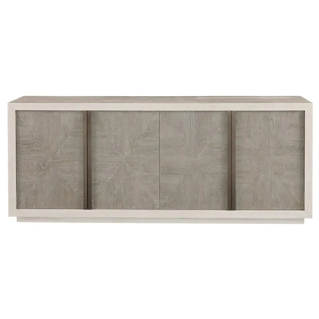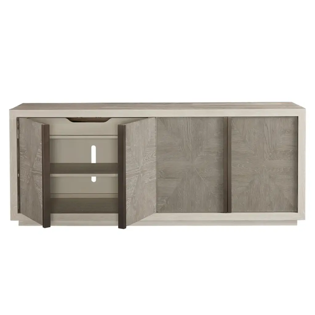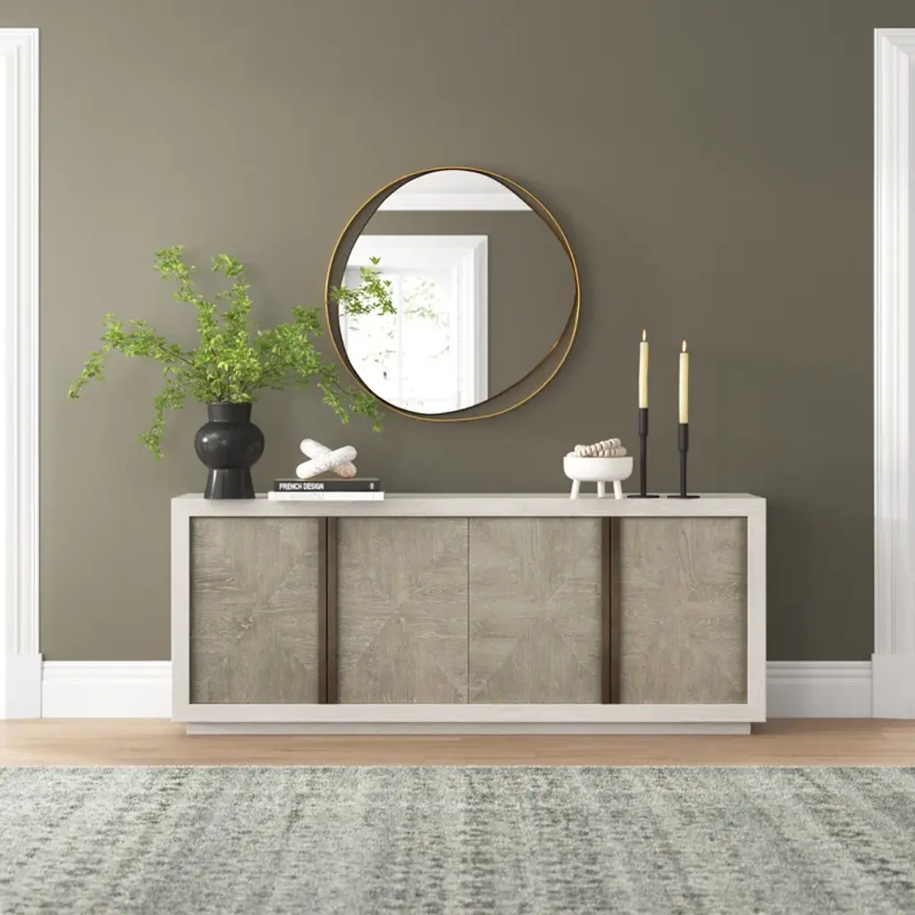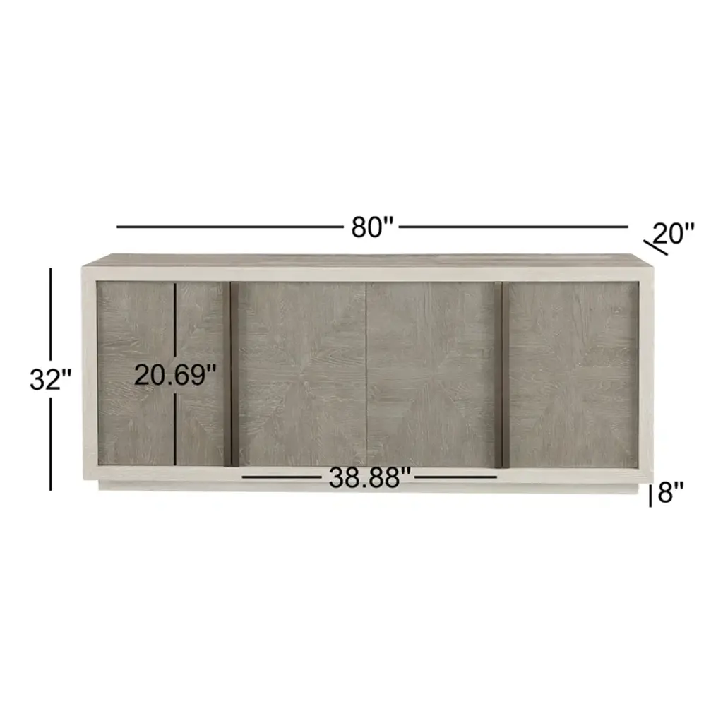Found: Your new favorite storage solution. Our modern credenza features two cabinets, each with a sliding drawer and two shelves – offering plenty of room for books, blankets, and more. We love how the gray doors subtly contrast the beige frame for an elevated look that goes with just about any decor. The open top lets this sideboard double as a sleek TV stand, making it a versatile must-have, and cable cutouts in the back keep your cords organized and out of sight. Arrives fully assembled.