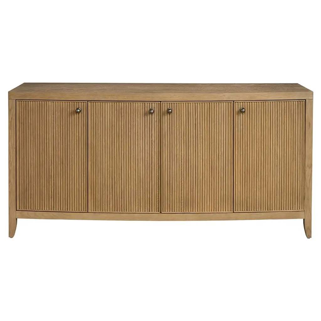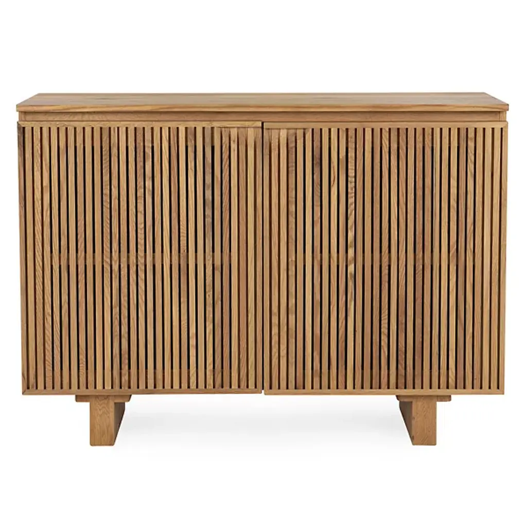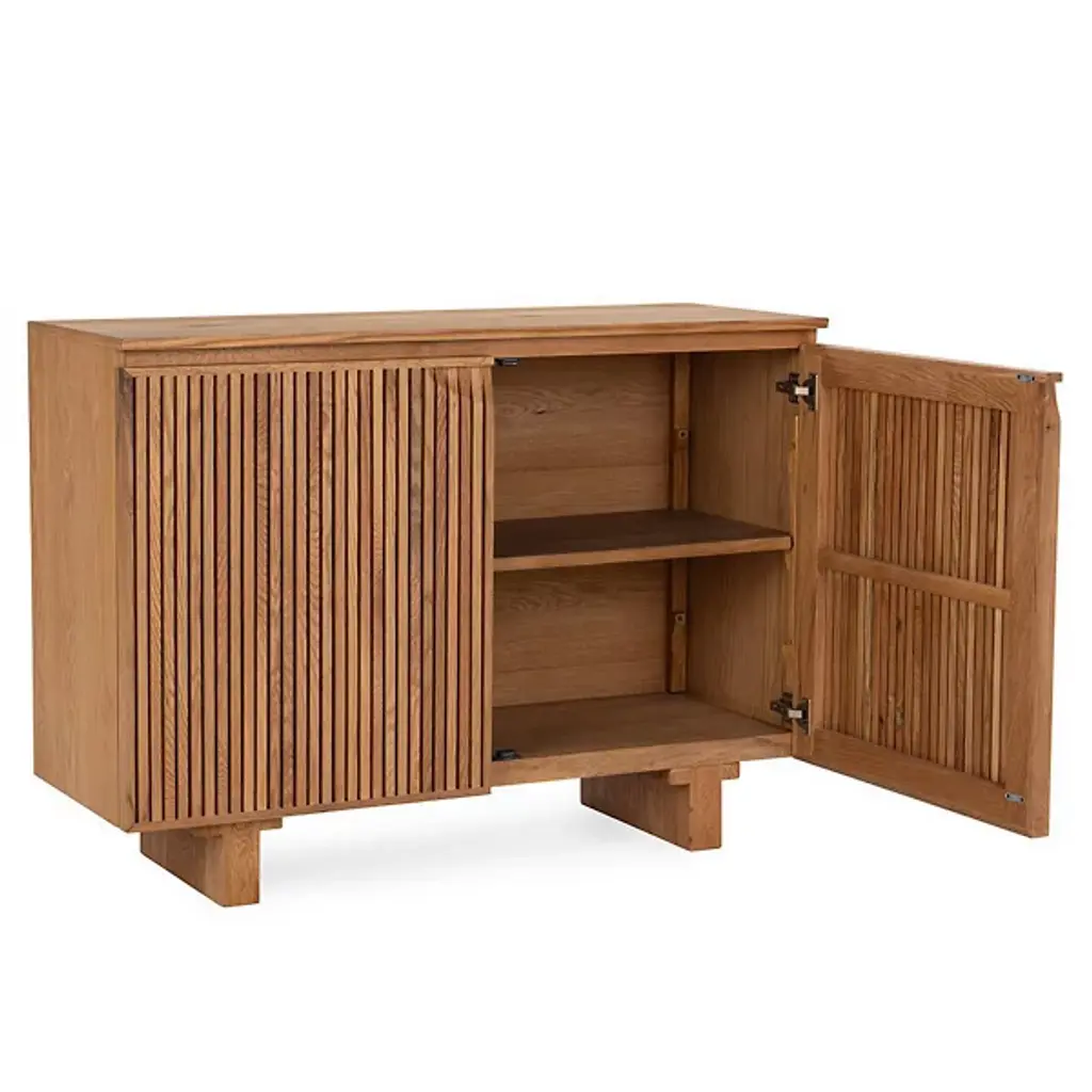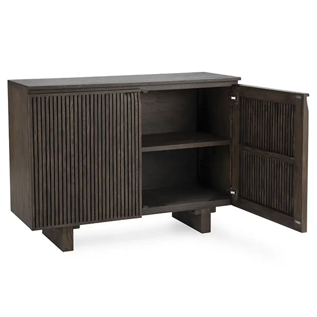 The Roya Sideboard Buffet from Classic Home mixes straightforward contemporary simplicity with sculptural charm. Made in Vietnam with a wood veneer finish, linear bases elevate the buffet slightly, with clean lines and paneled doors with linear accents that create a rustic modern look. Interior shelving keeps items organized, while a rear cord-management cutout adds convenience for media or electronics. Distinct variations in tone and texture show off the natural charm of the materials.