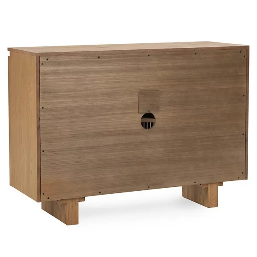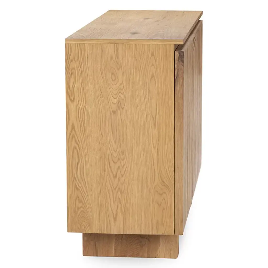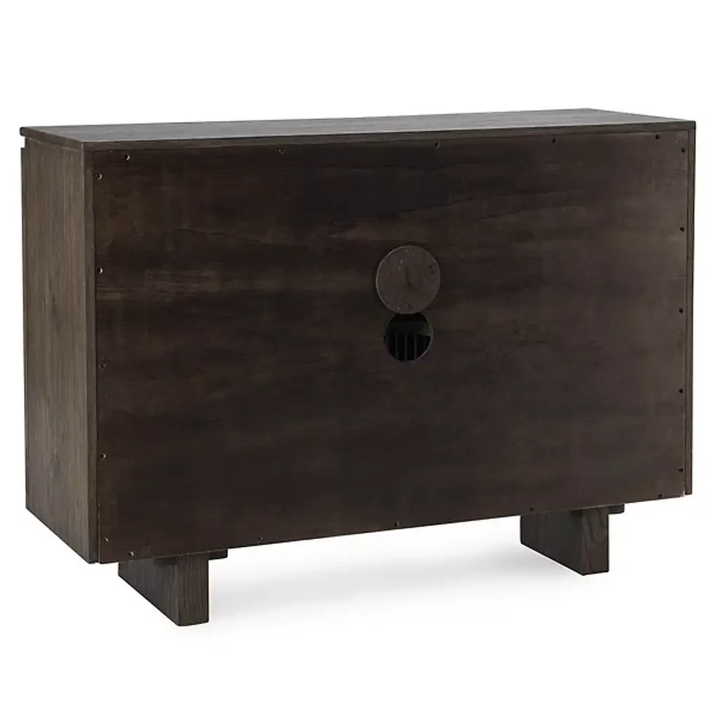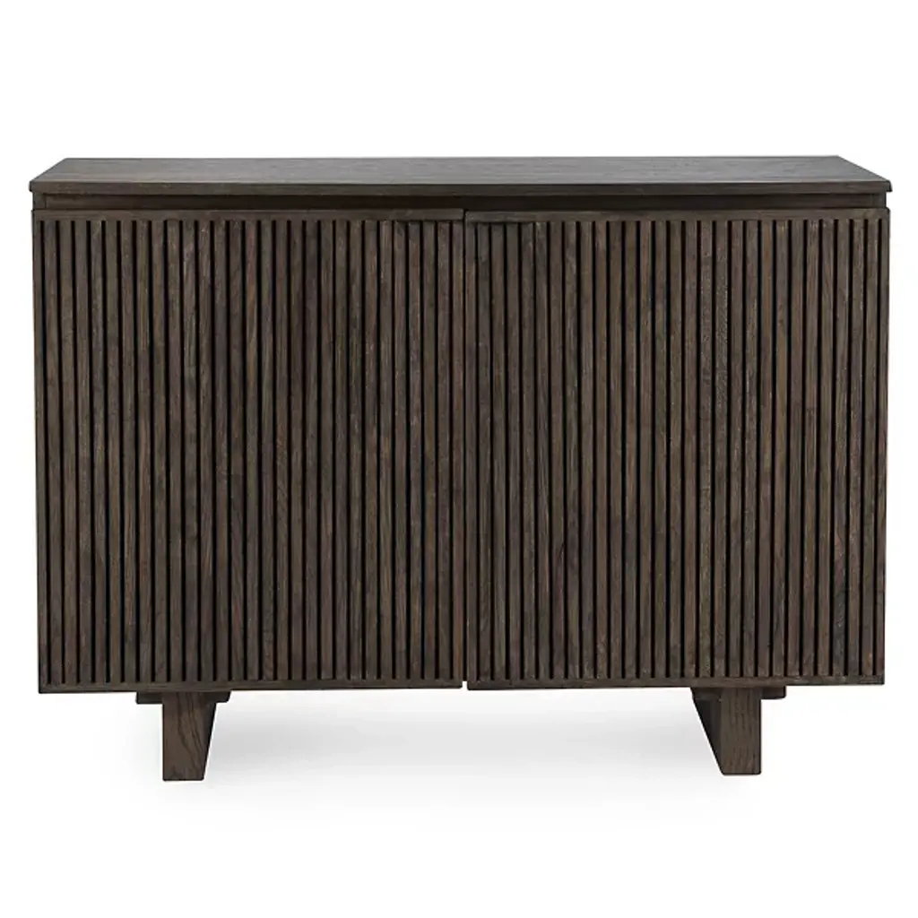 The Roya Sideboard Buffet from Classic Home mixes straightforward contemporary simplicity with sculptural charm. Made in Vietnam with a wood veneer finish, linear bases elevate the buffet slightly, with clean lines and paneled doors with linear accents that create a rustic modern look. Interior shelving keeps items organized, while a rear cord-management cutout adds convenience for media or electronics. Distinct variations in tone and texture show off the natural charm of the materials.